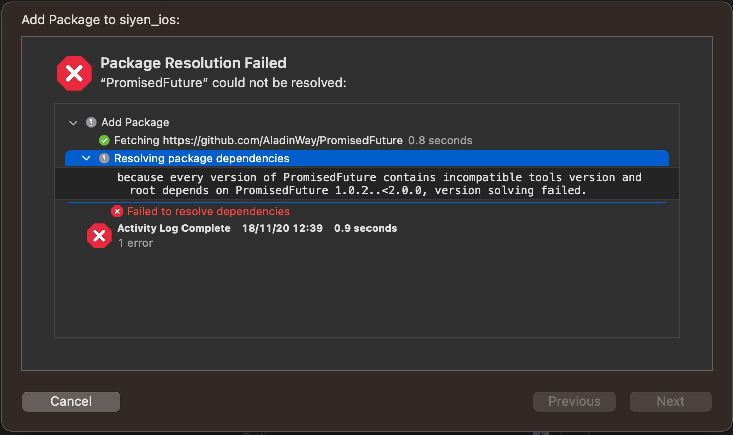 Hi I'm getting this message: ``` because every version of PromisedFuture contains incompatible tools version and root depends on PromisedFuture 1.0.2..<2.0.0, version solving failed. ``` <img width="731" alt="Screen Shot 2020-11-18 at 12 52 07" src="https://user-images.githubusercontent.com/19939271/99574337-e0516600-299c-11eb-902b-8853014379ad.png">
