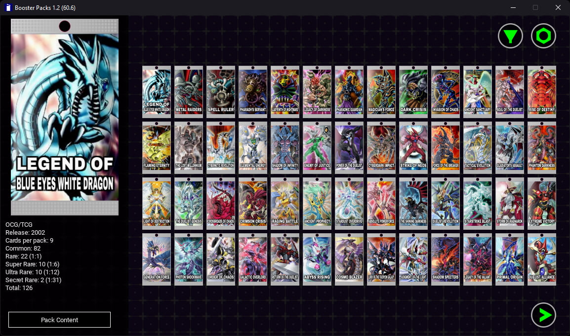 - Content Screen: where all the cards in the pack are displayed;