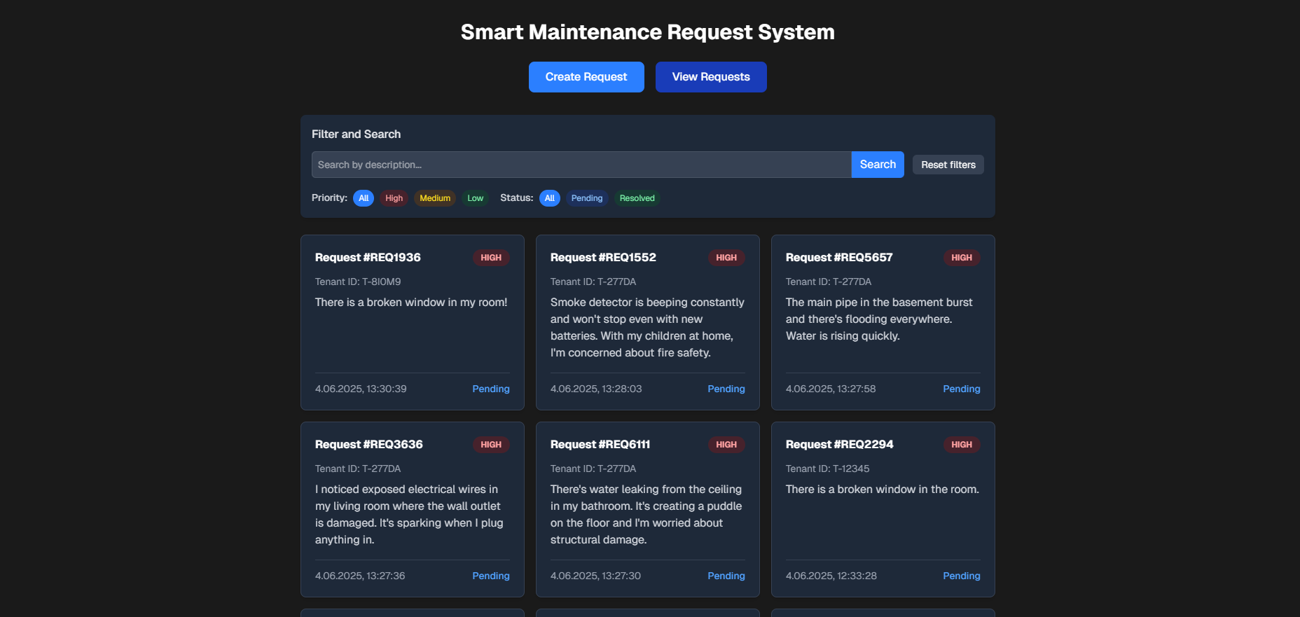 Smart Maintenance Request System is a web application that automatically analyzes and prioritizes maintenance requests from tenants. The system helps property managers quickly distinguish urgent issues from less important ones, streamlining property maintenance operations.