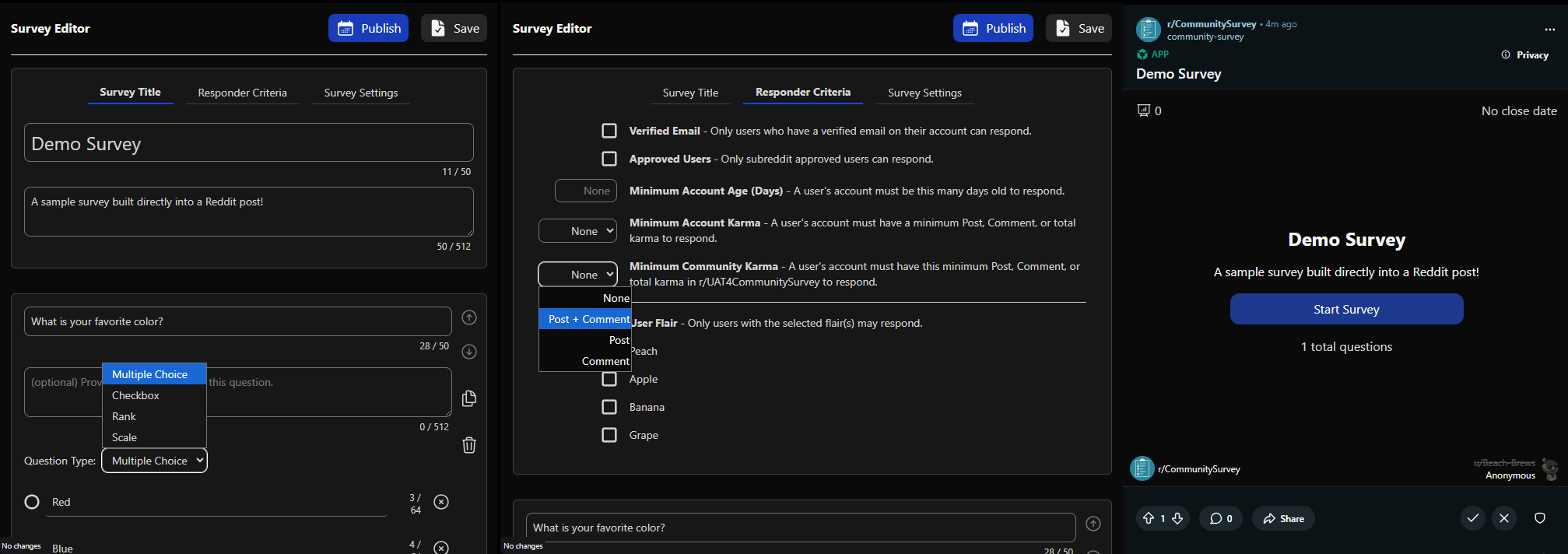 Moderators are able to create surveys, schedule publish and/or close dates, choose responder criteria, when and who can see results, and view the aggregated responses. Published surveys appear directly in the user's feed, allowing them to respond and view results without having to leave Reddit. This not only helps increase user engagement, but also allows the survey author to choose user account criteria to ensure accurate results for the target audience (e.g. users with a minimum subreddit karma or account age).
