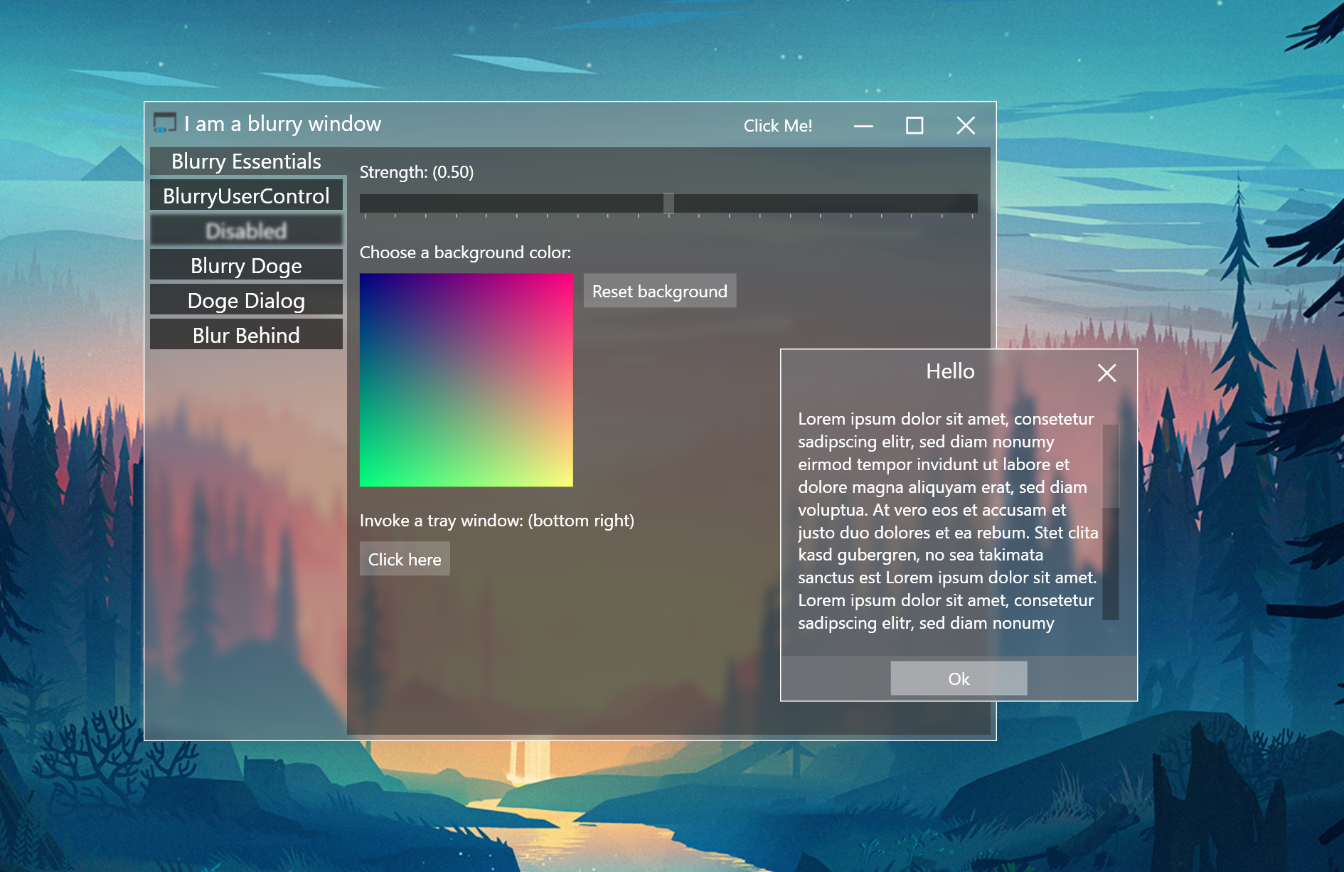 The BlurryControls library is meant to give your application a blurry look as it is known from the AeroGlass design. Please consider that this library runs on Windows 10 only! On Windows 8.1 or older operating systems the application may just appear transparent without any effect. The blurry look is not to be confused with the Acrylic Material appearance of UWP applications (example project).
