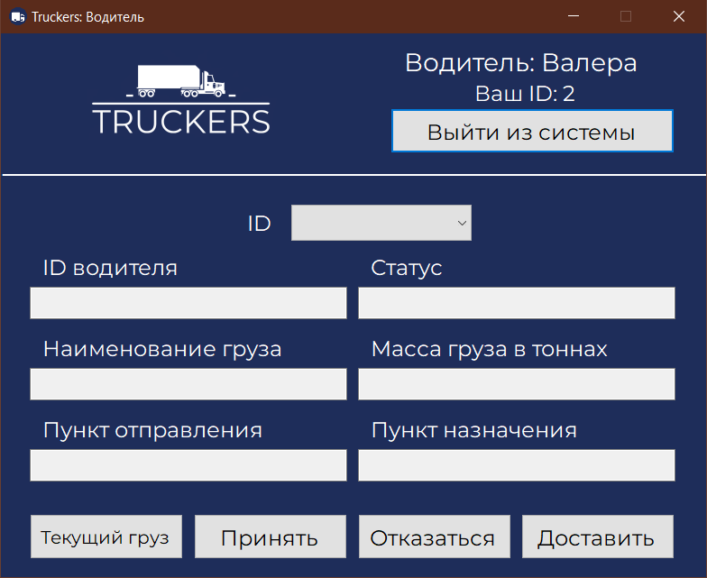 Принятьto accept cargo based on the selected ID. This action will assign your ID to theID водителяfield, and theСтатусfield will change to "on the way". - Click