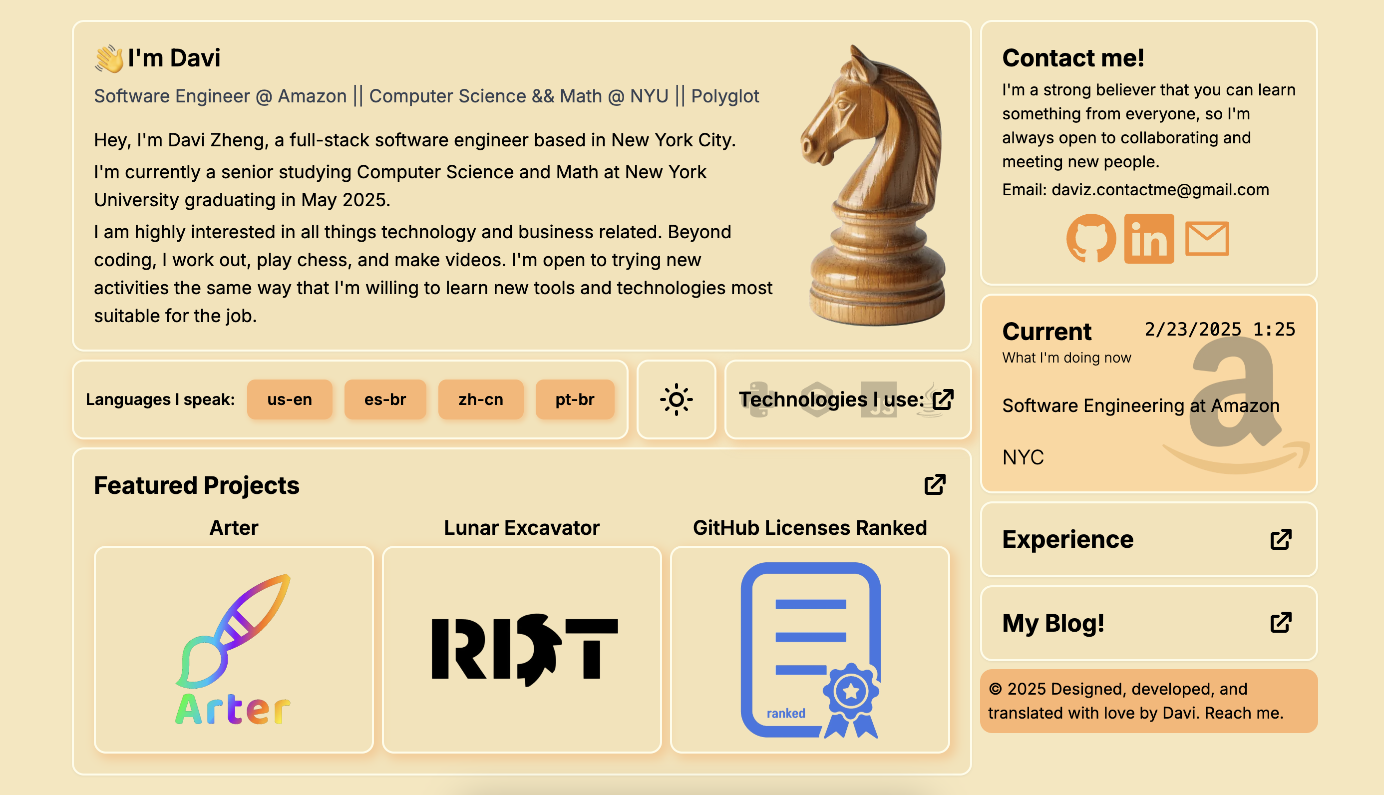 I love my previous personal website, but I wanted to see how creative I could be. Recently, I have been fascinated by minimalistic, smart, and artistic designs, especially bento-style websites. I also love eating bento. Thus, I decided to create a new bento-style version of my website.