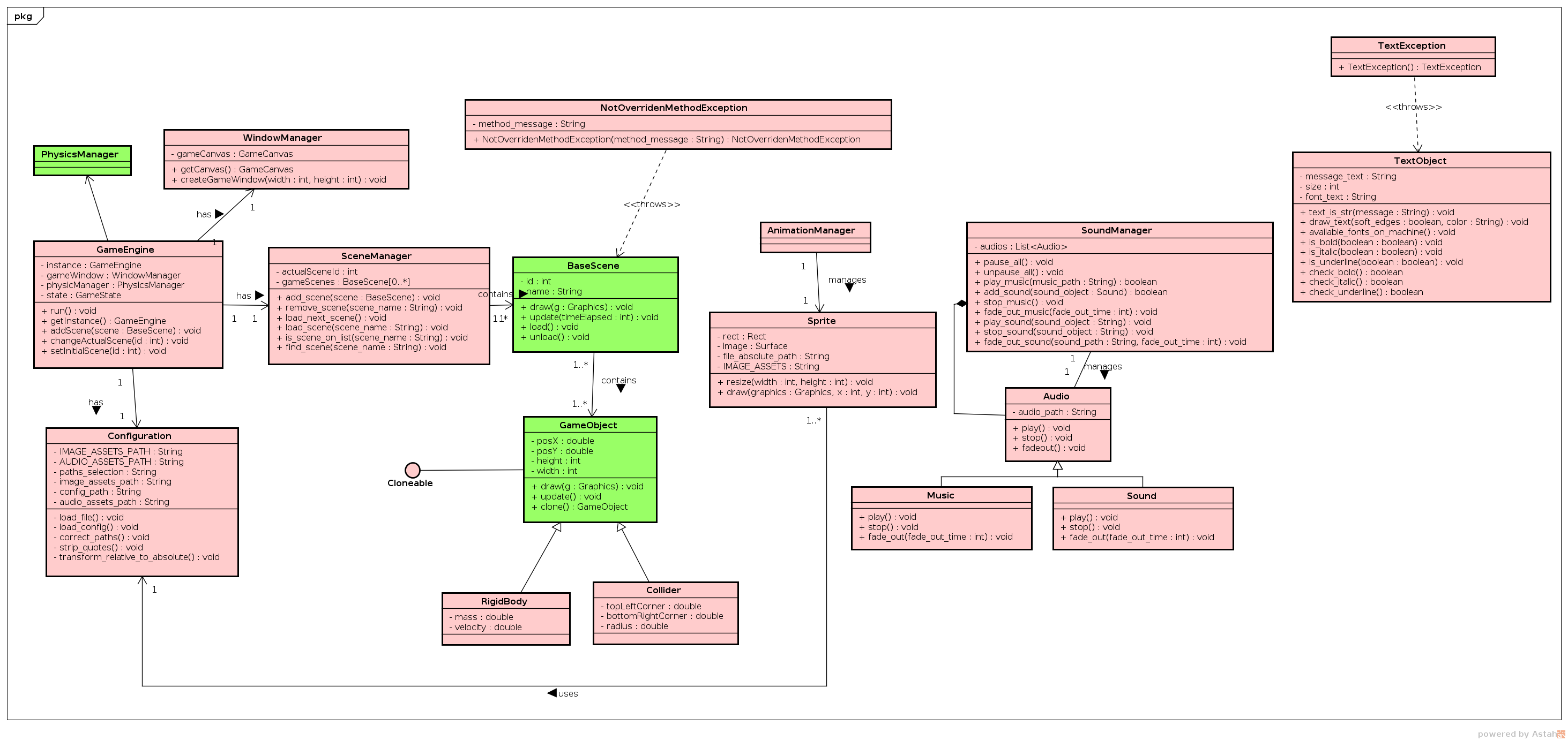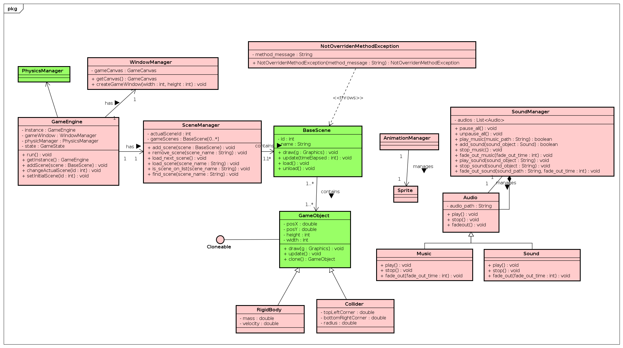 | BaseScene | Uma Scene é a estrutura que controla vários GameObjects num contexto específico. Toda tela de um jogo é uma Scene. A classe BaseScene serve de estrutura base para que o desenvolvedor crie suas próprias telas. |