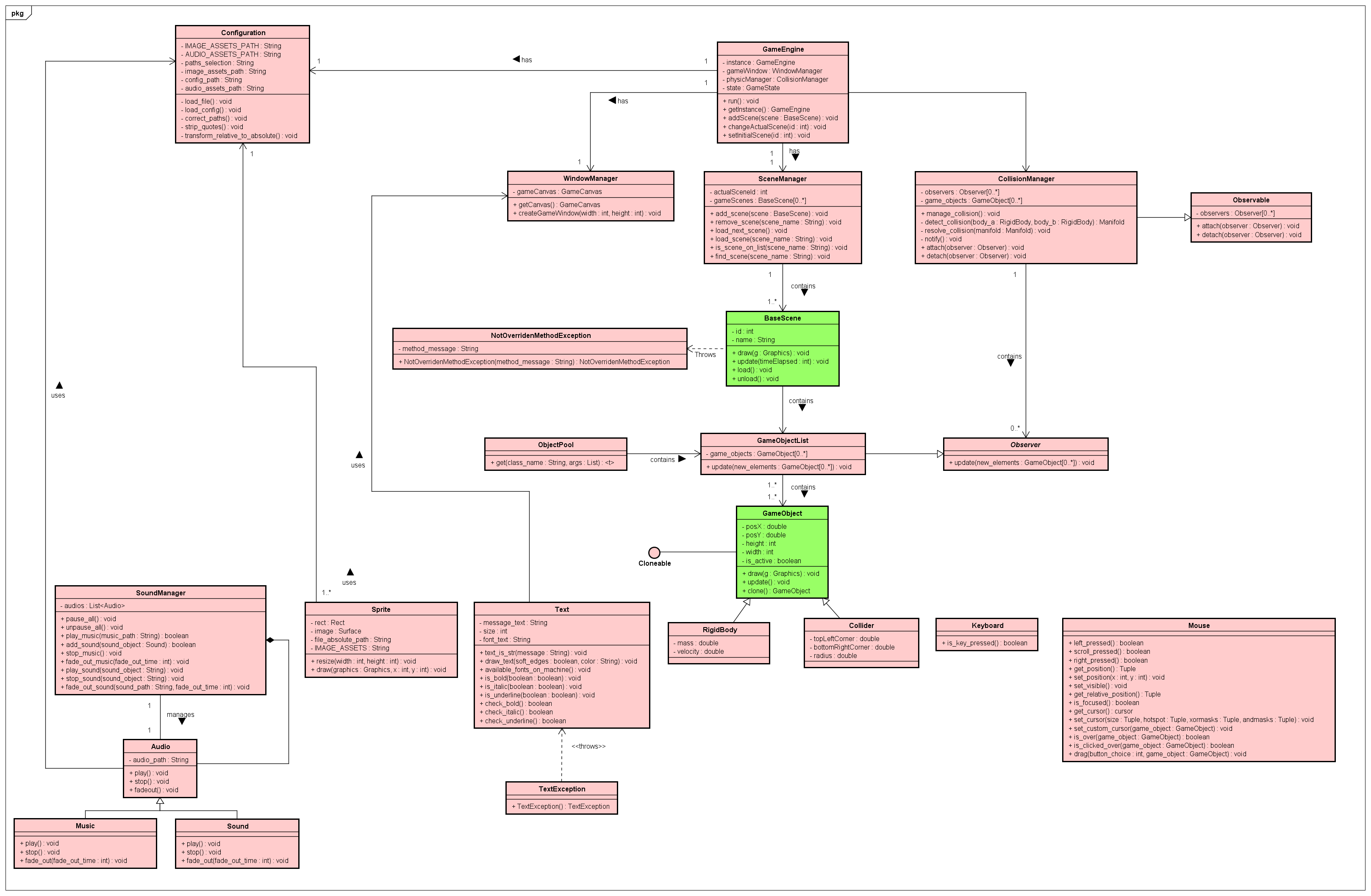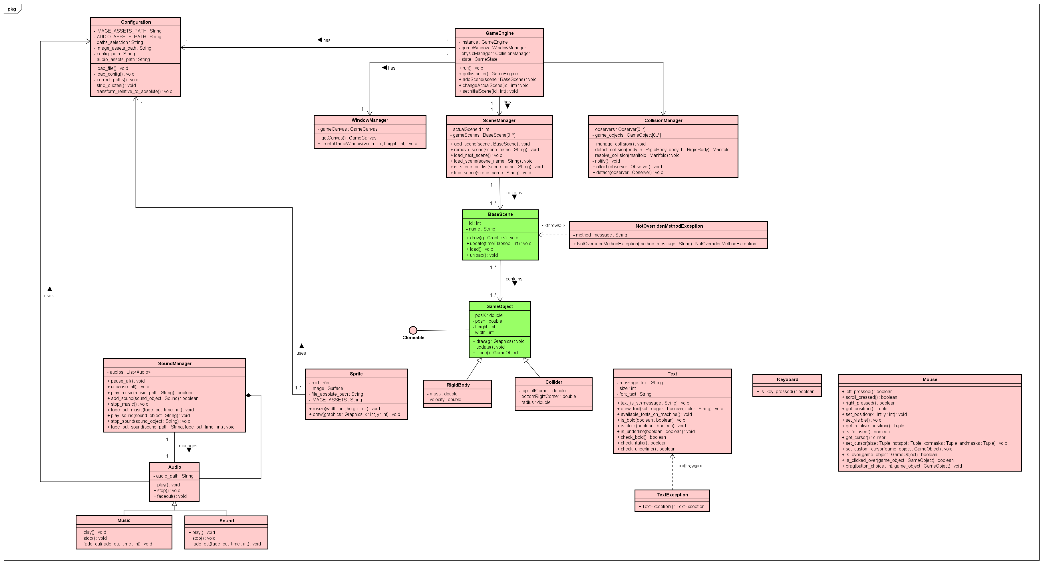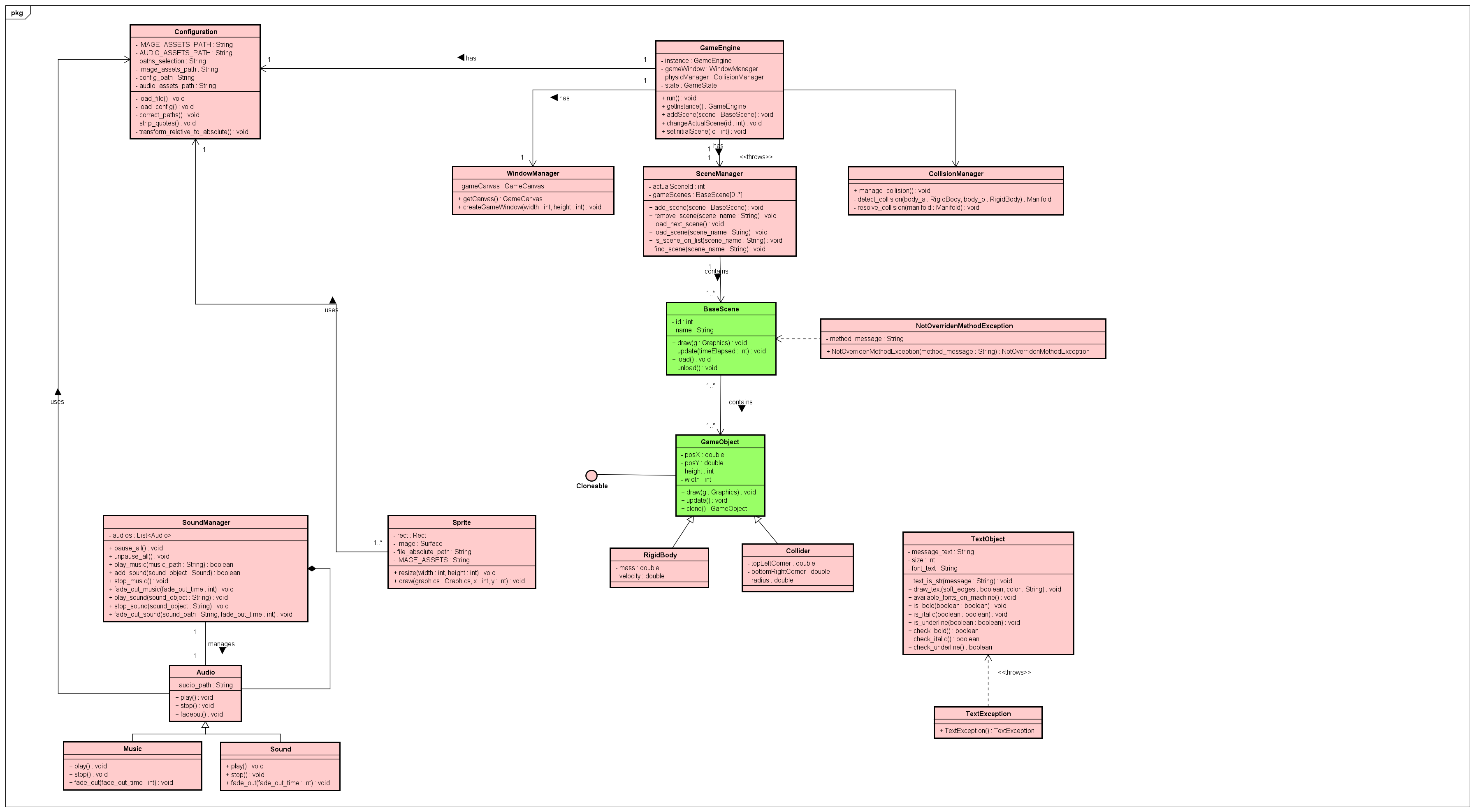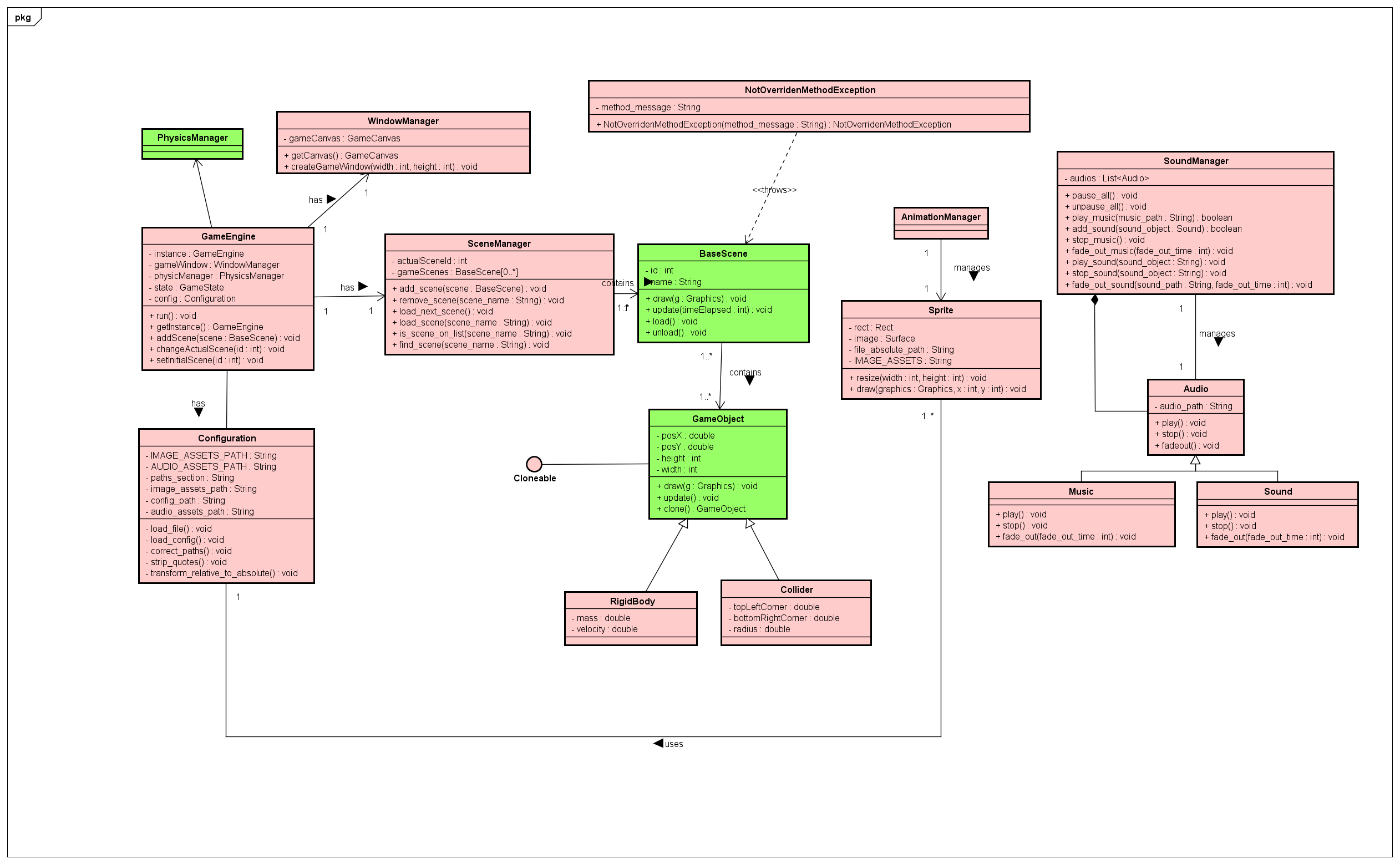 | GameEngine | A classe principal da Engine, que será utilizada pelo desenvolvedor pra incluir suas cenas personalizadas. |