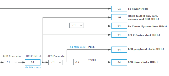 In my project the frequency of mcu is set to 64MHz, as well as clock source for Timers(APB timer clocks)