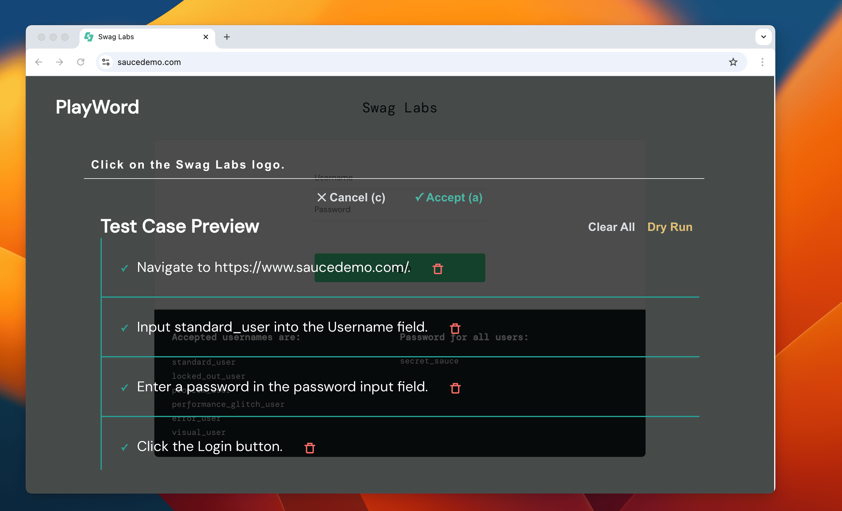 await playword.say('Type standard_user into the username field, secret_sauce in the password field')Hardcoding sensitive information in your test cases is not a good practice.