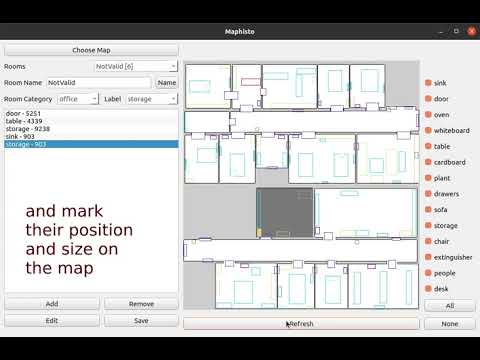 MAPhisto - An Editor for Abstract Semantic Maps User friendly editor for semantics enchanced robot localization. Created by Nicky Zimmerman and Lior Rozin. Installation Required dependencies pip install numpy matplotlib opencv-python Usage To use the editor, run python napp/Maphisto.py