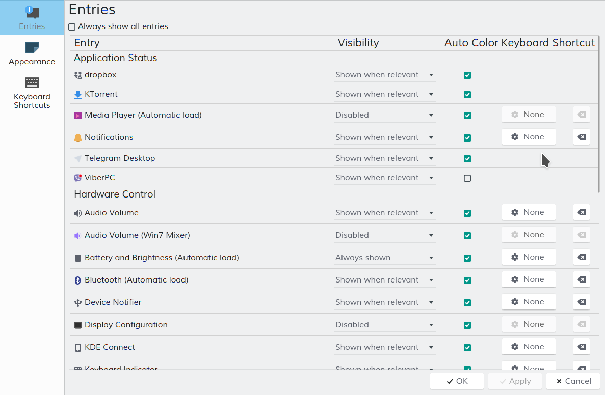 - Use with care and in case your systray breaks (it can happen during plasma upgrades) just remove tweaks from your