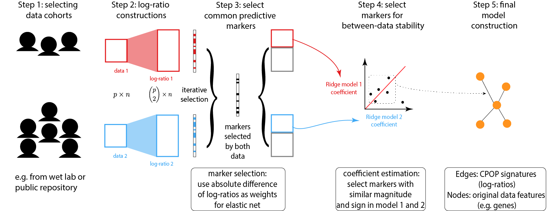 Due to data scale differences between multiple omics data, a model constructed from a training data tends to have poor prediction power on a validation data. While the usual bioinformatics approach is to re-normalise both the training and the validation data, this step may not be possible due to ethics constrains. CPOP avoids re-normalisation of additional data through the use of log-ratio features and thus also enable prediction for single omics samples.