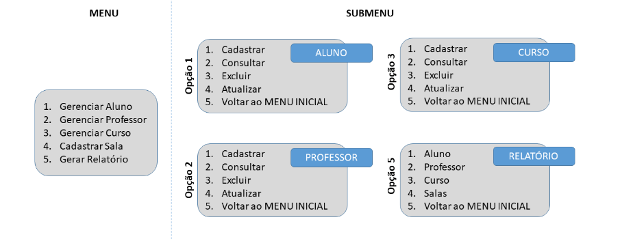 O sistema permite o cadastro de diferentes tipos de dados, como alunos, professores, gestores, cursos e salas de aula. Cada um desses cadastros é realizado de forma independente e requer informações específicas.