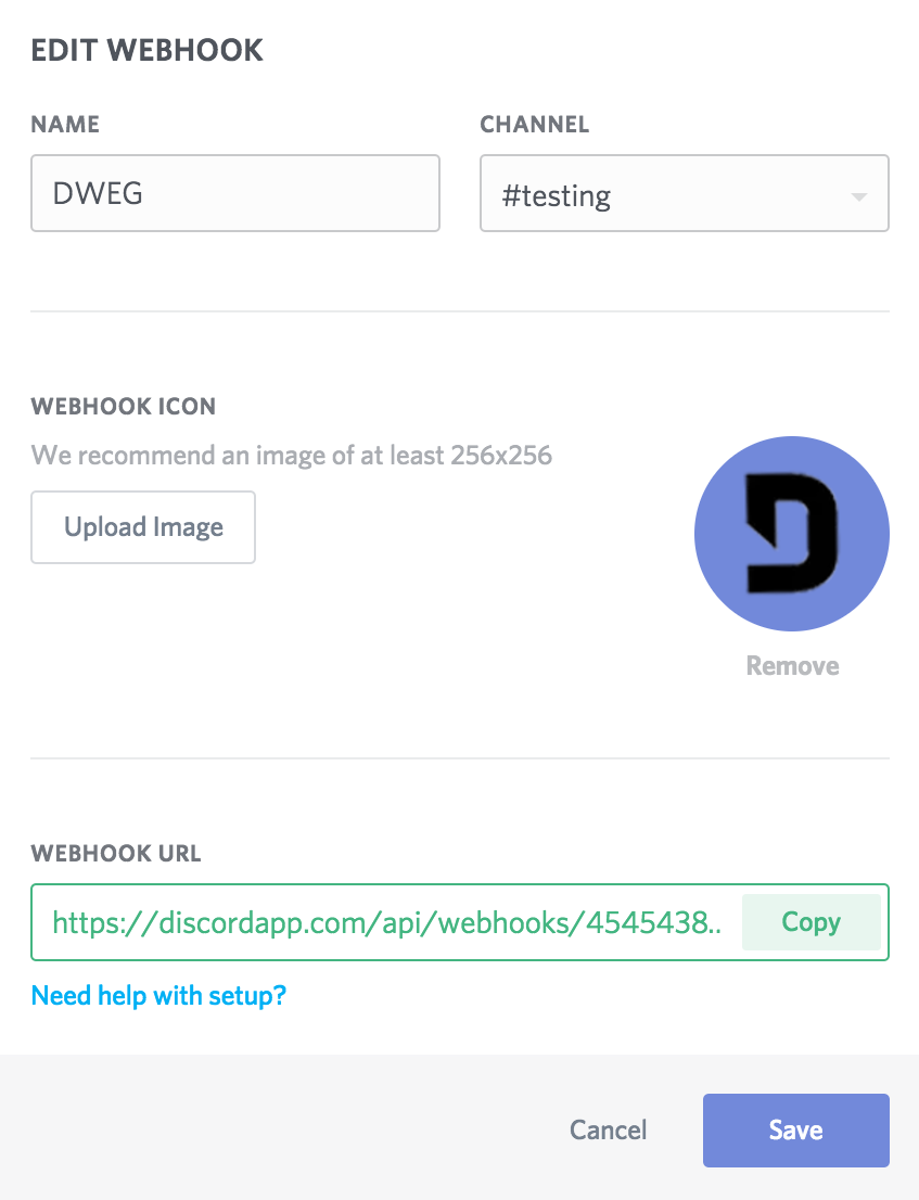 The script will first ask for your webhook URL. This will be provided at the bottom of the webhook editing panel for the webhook. Make sure that you've also already set your webhook's profile picture and username.