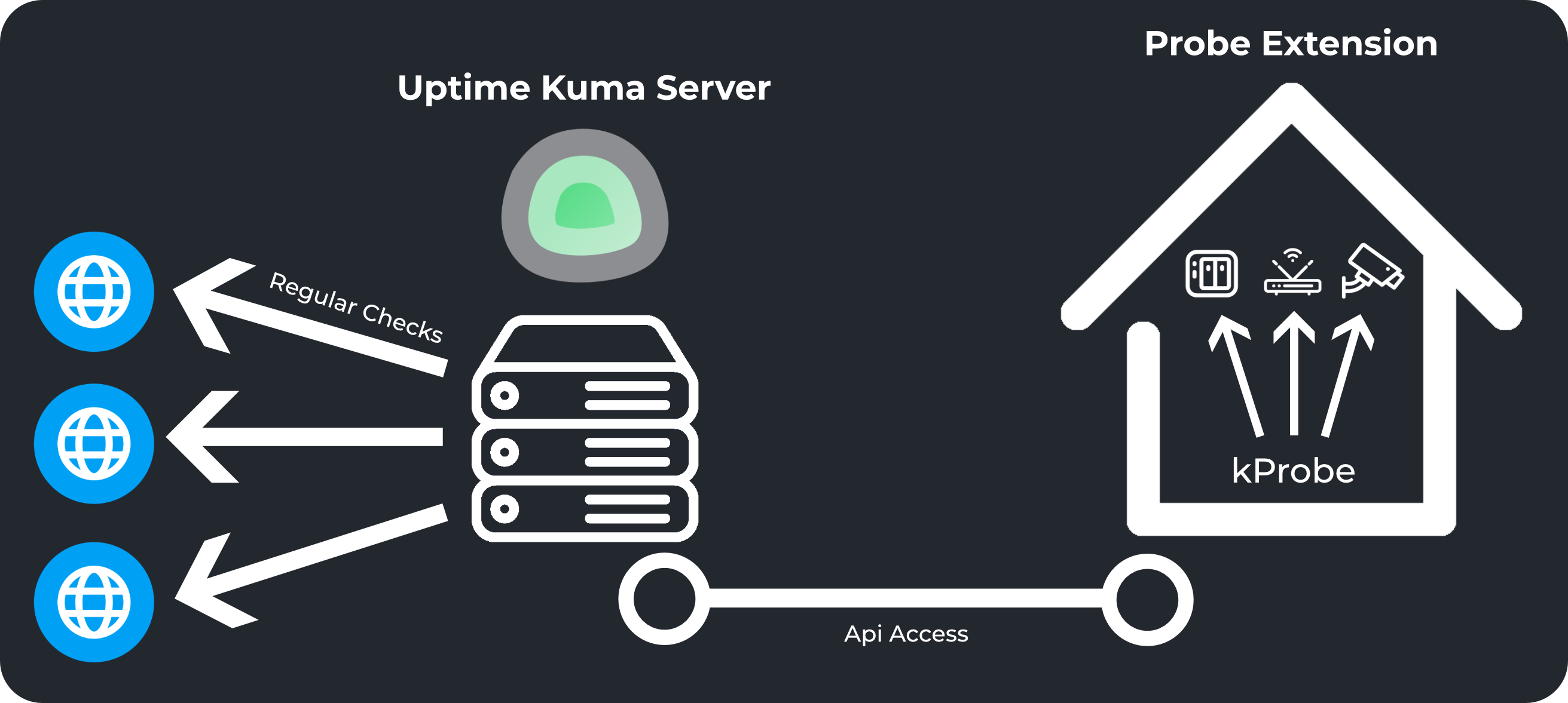 - This extension fills that gap by running inside your LAN, checking local devices (Wi-Fi access points, cameras, internal services, etc.) and exposing their status through an HTTP API that your main Uptime Kuma instance can query.