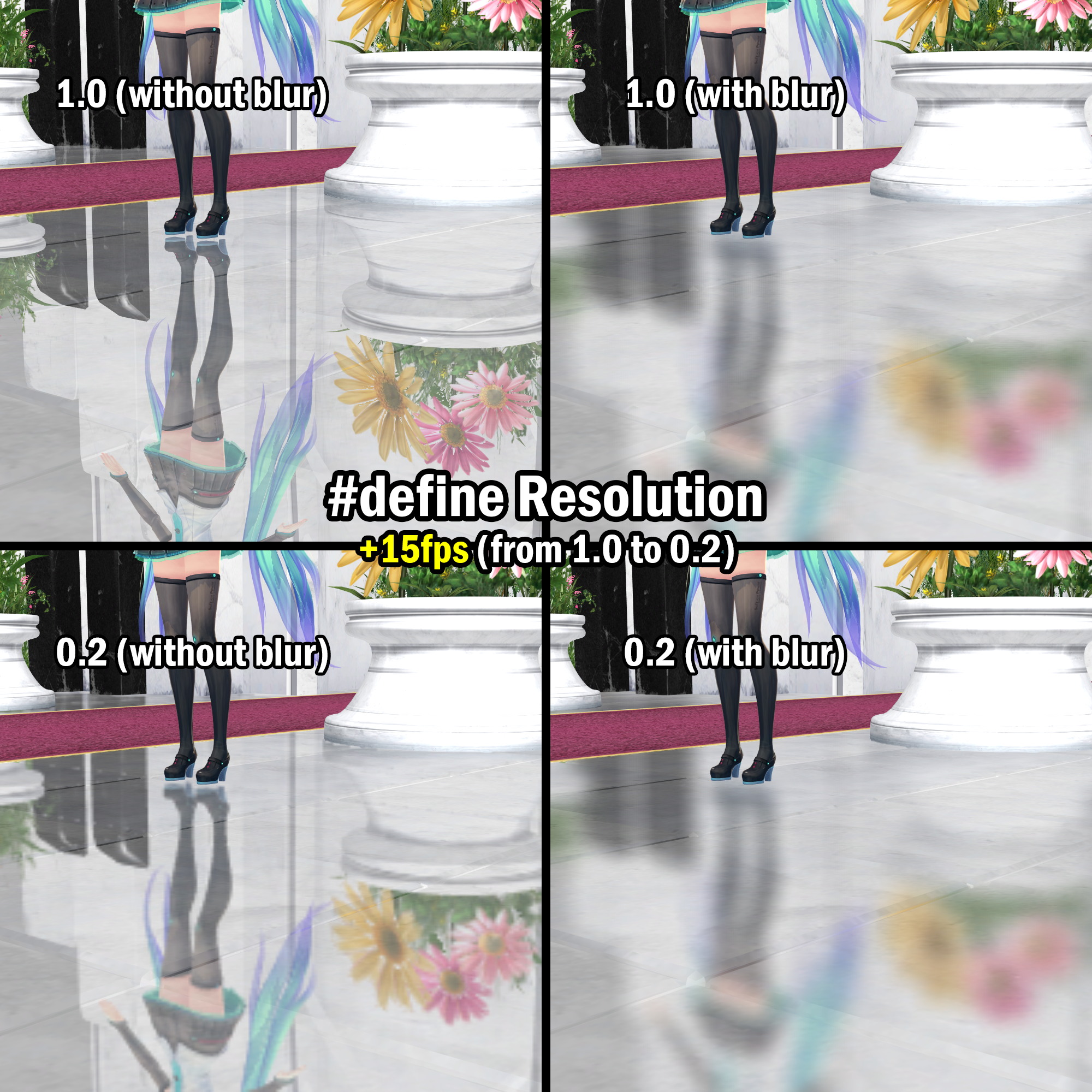 - In case the effect causes low frame rate (bc you run serveral surfaces at once, or your computer is simply a potato), you can change the resolution of the reflection by changing the #define Resolution value in WorkingFloor2_Blur.fx. Reasonably low resolution should still look decent when being blurred, and it increases the frame rate