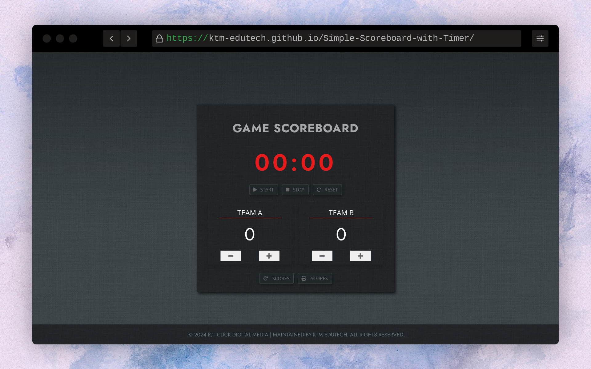 The Simple Scoreboard with Timer is an intuitive web-based tool designed to keep track of scores and manage timing for various sports and games. This application features a clean and modern interface, making it easy to use for any event.