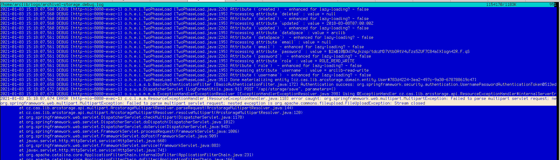 Když v konfiguračním souboru aplikace application.yml, resp. application.properties deaktivuji DEBUG mód, tak k pádům/výjimkám nedochází a data se řádně dostanou do archivní části uložiště: