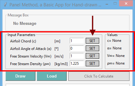 The user must set four aerodynamic and geometric parameters for the calculation to be done. This is a very straightforward action, done by clicking the SET buttons as seen below. The default values are unit chord and unit velocity, zero angle of attack and air density at sea level.