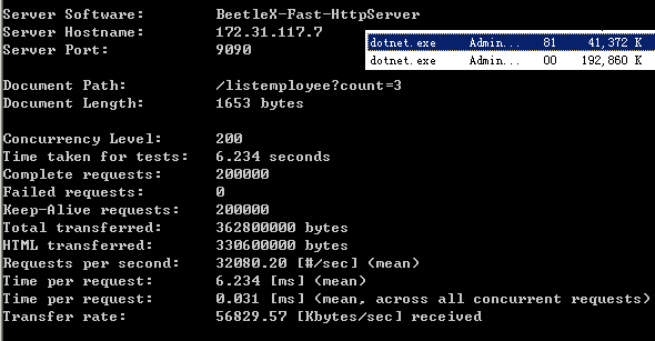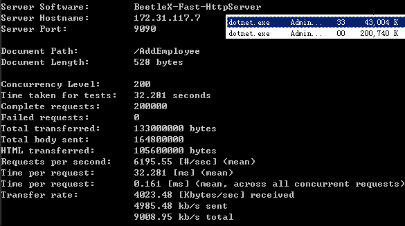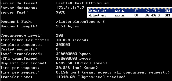 是dotNet core下基于Beetlex实现的一个高度精简化和高吞吐的HTTP API服务组件,它并没有完全实现HTTP SERVER的所有功能,而是只实现了在APP和WEB中提供数据服务最常用两个指令GET/SET,满足在应用实现JSON,PROTOBUF和MSGPACK等基于HTTP的数据交互功能,虽然是一个精简版本但针对SSL这方面的安全性还是支持。有牺牲就必然有收获,FastHttpApi作出这么大的精简必然在性能上有所收获取,经测试FastHttpApi在GET/POST这些数据交互的场景下性能和吞吐能力是Asp.net core集成的Kestrel的2倍以上。