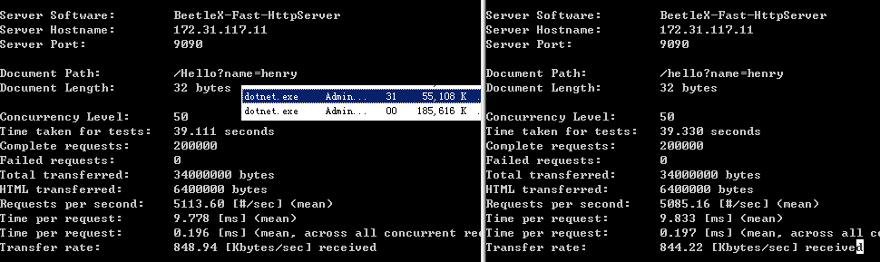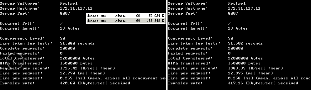 对比一下两者在accept connection上的性能差异,开启了两个AB实例进行压测
