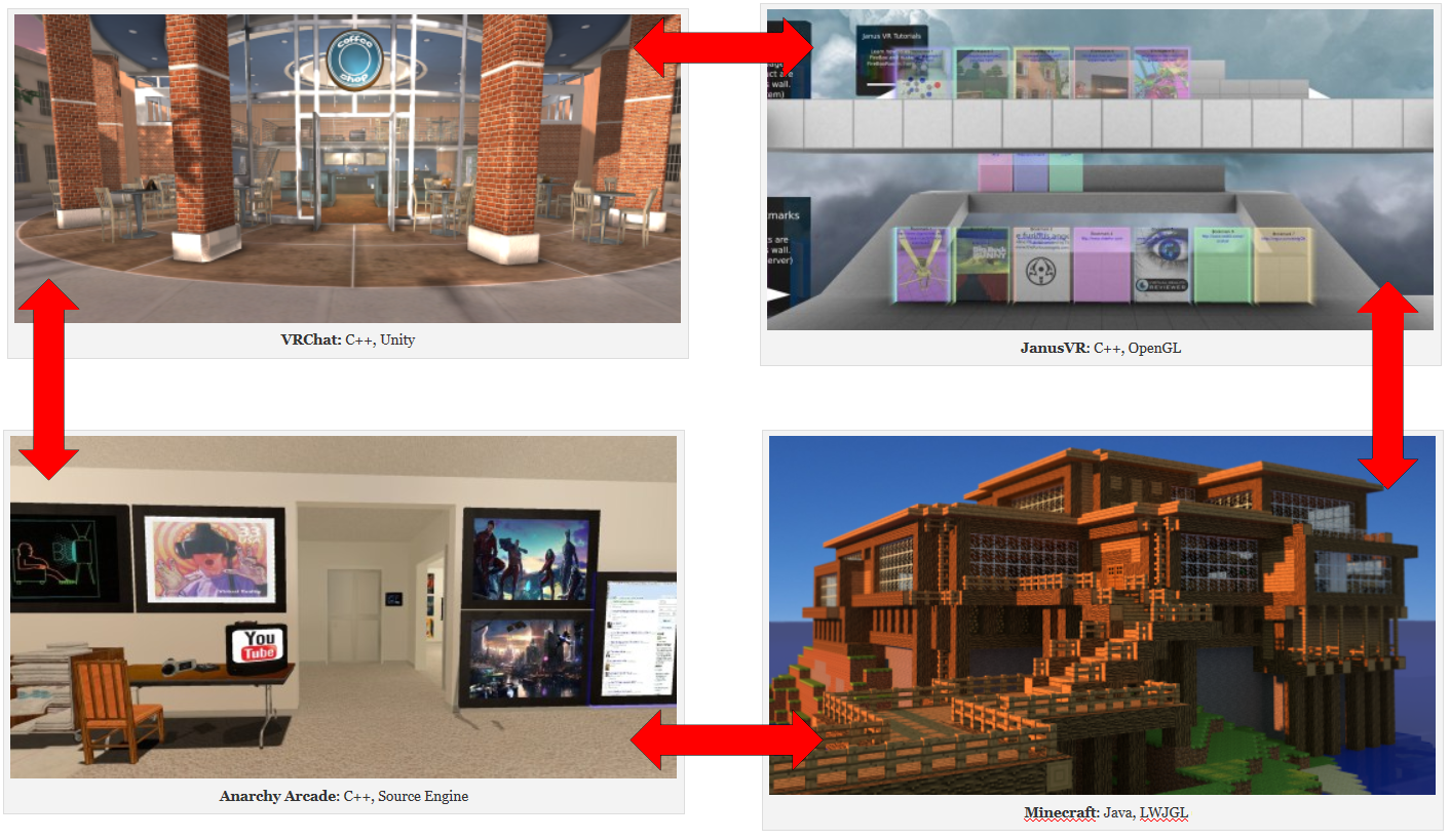 "Instead of building one large Metaverse and splitting it into pieces, as has been done before, I looked at a different solution. How do we start with a bunch of unrelated pieces of software and combine them together to form a larger Metaverse? ... There are different authors, languages, graphics libraries, and more. If you wanted to create a way for players (avatars) to actually move between them, how could it be done? How would you move from JanusVR to Minecraft? How do you walk from Minecraft into VRChat?" - Traveling Between Unrelated Virtual Worlds by Atari_Historian