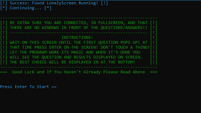 When it's time for the questions to show up you must press Enter on your terminal. Try to do it once all words have finished moving and things are steady. Then press Enter and wait for the program to send back the answer! Simple as that! (Not all answers may be correct but this has an 8.10 avg. hit rate! You only have to guess two answers hopefully...)