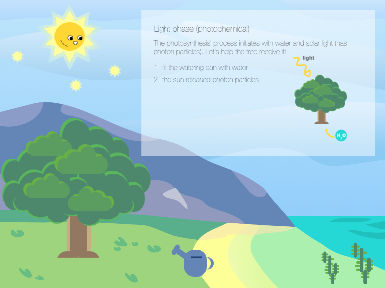 I've built an educational playground to teach about a topic that I really enjoy thinking and discussing about: the things that make life possible. The user is responsible for making the photosynthesis process happen, it must read the content message and follow the instructions to make the actions need in each photosynthesis’ phase.
