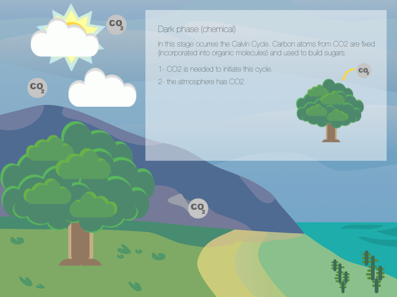 The scene and layer compositions were based in the phases of photosynthesis, representing the light and dark phases, and their respective unfolding events, in a flow that is simple and friendly to understand.