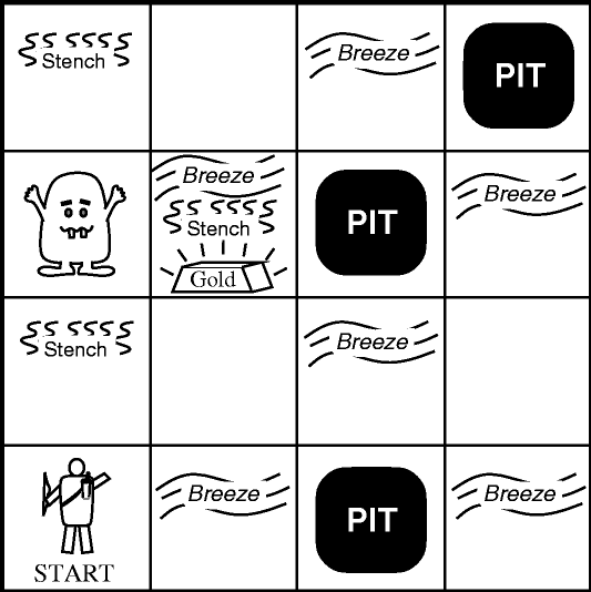 Wumpus World is the representation of a simple world where an explorer searches a dark, dangerous cave in search for a bounty of gold. In this cave, there are two threats to the explorer’s life: falling in bottomless pits (P) and being slain by the Wumpus (W). The explorer’s goal is to find the gold (G) then exit safely by backtracking through the cave. Typically, the cave is represented by a 4×4 grid or 16 rooms. Each room will have indicators that can be detected by the explorer. If the explorer smells a stench (S) that means that Wumpus may be in an adjacent tile. If the explorer feels a breeze (B) that means that a bottomless pit may be in an adjacent tile. If the agent sees glitter that means that there is gold in the current room and upon retrieval of the gold, the explorer is allowed to leave the cave. While exploring the cave, the explorer gathers knowledge and acts according to the gathered knowledge; this type of behavior makes the explorer a knowledge-based agent.