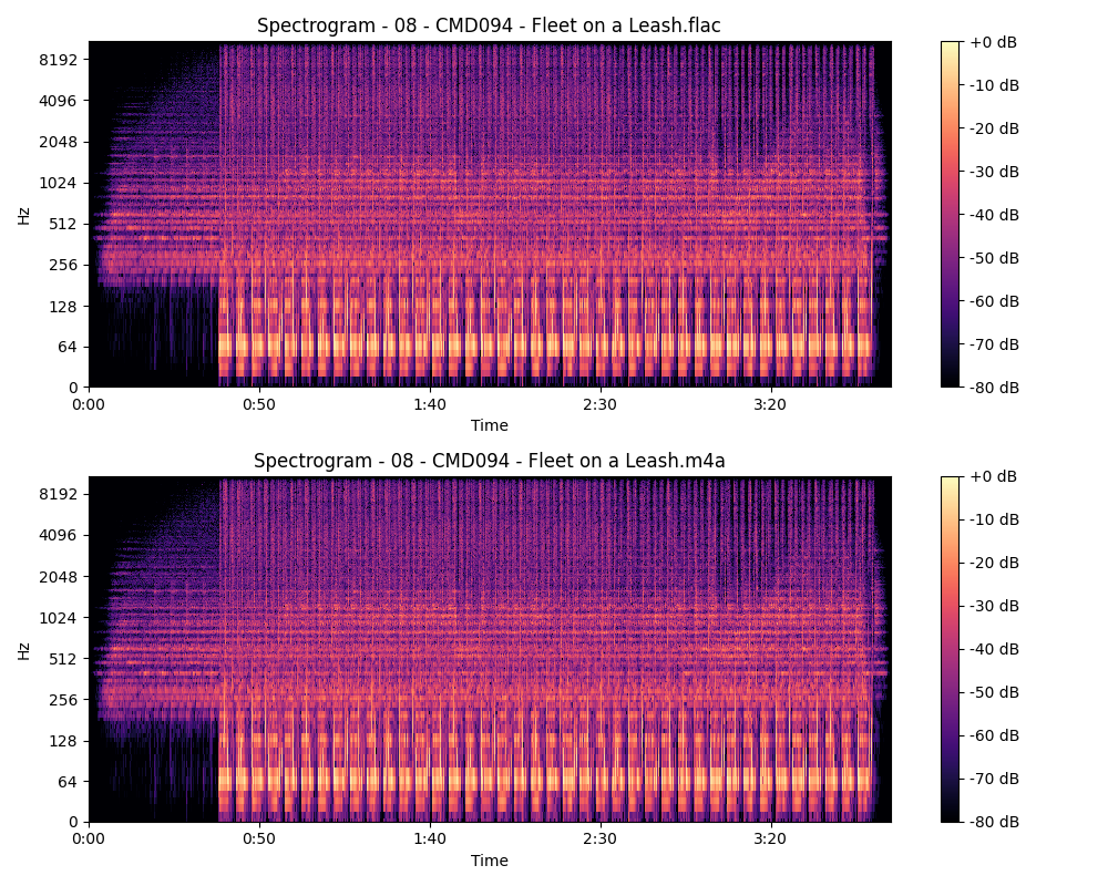 This script compares two audio files using a spectrogram during the first 8 minutes or less.