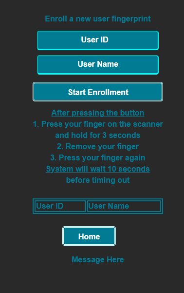 Enrollment of new users is done by assigning an integer ID from 1 to 50 and a name of the fingerprint owner. The ID can be used later to remove the fingerprint from the system. The name will be displayed with a welcoming sign on the touchscreen when a user enters the using a fingerprint The table under the instructions will contain the list of already assigned ID's and matching names. the data is fetched from the arduino, and is kept in the device after shutting down the arduino as emulated EEPROM using flash.