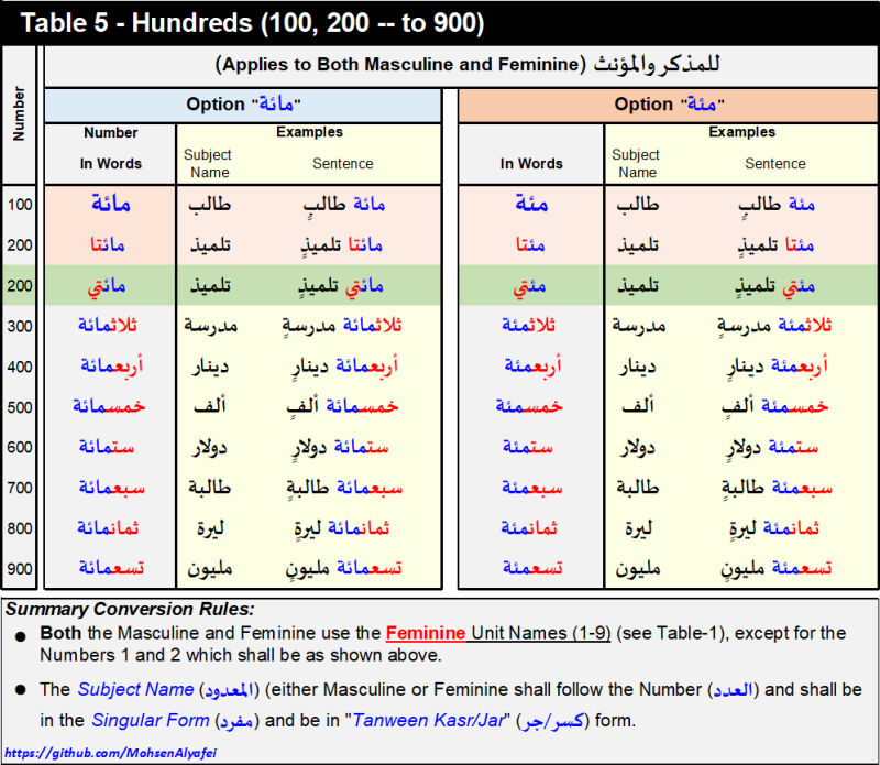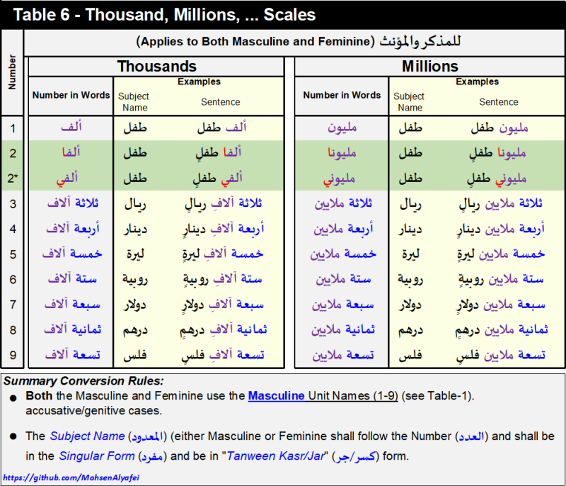 The following table provides a summary of the numbers to Arabic words basic conversion rules.