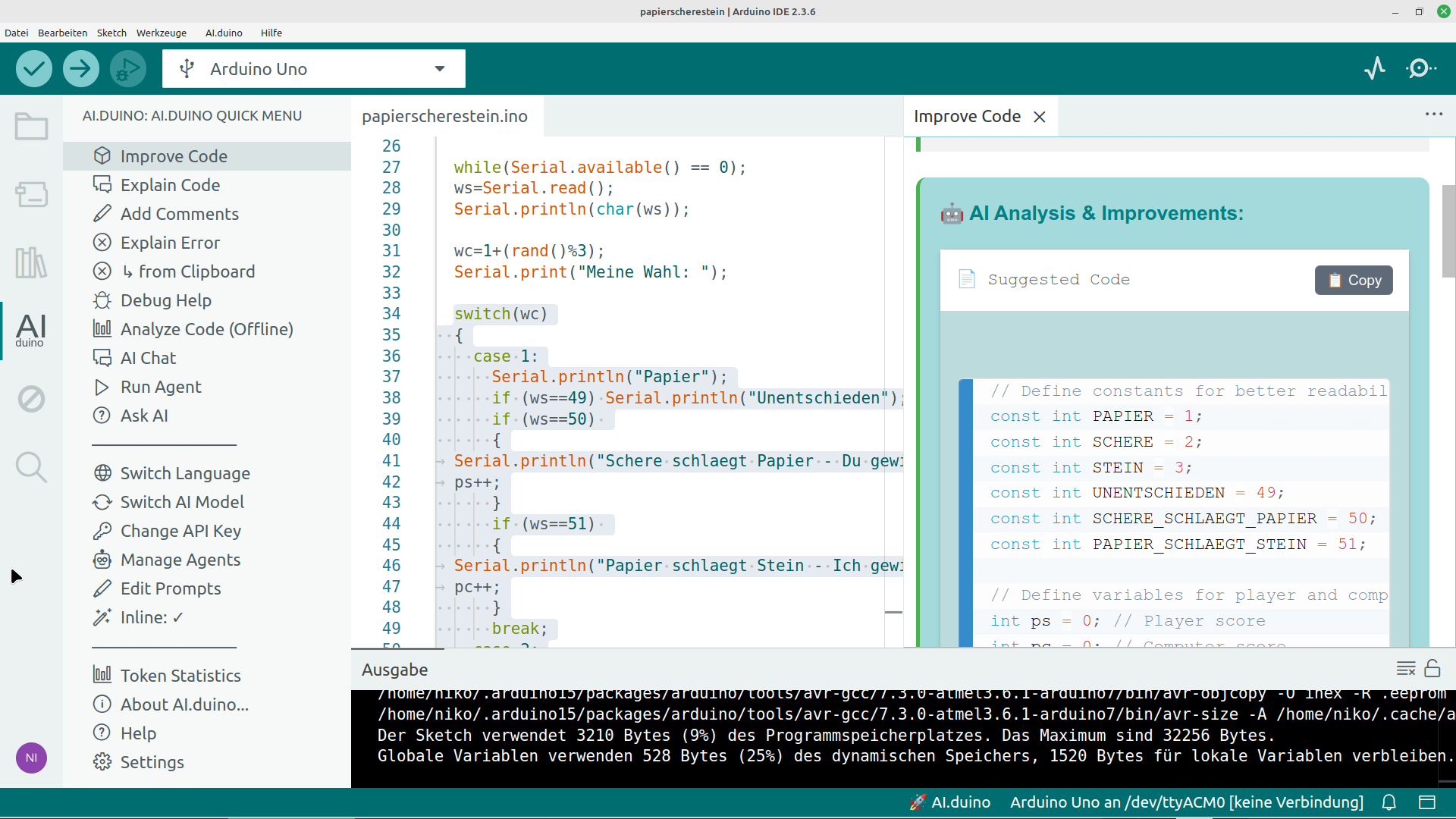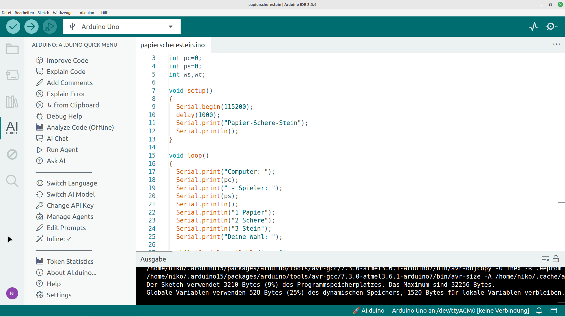 AI.duino integrates the API providers Claude, ChatGPT, Gemini, Mistral, Perplexity and Cohere, Croq, aggregator services OpenRouter and Hugging Face, and local providers Claude Code, Codex CLI, LM Studio and Ollama directly into the Arduino IDE for intelligent code assistance. It also works with VS Code. Please use the newest Version to avoid annoying bugs.