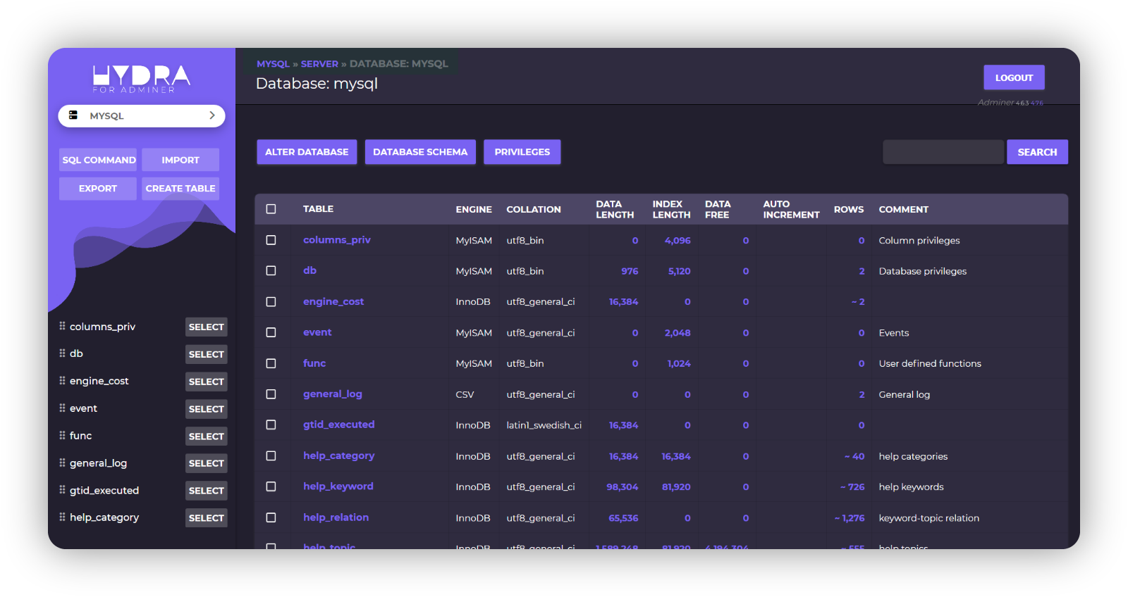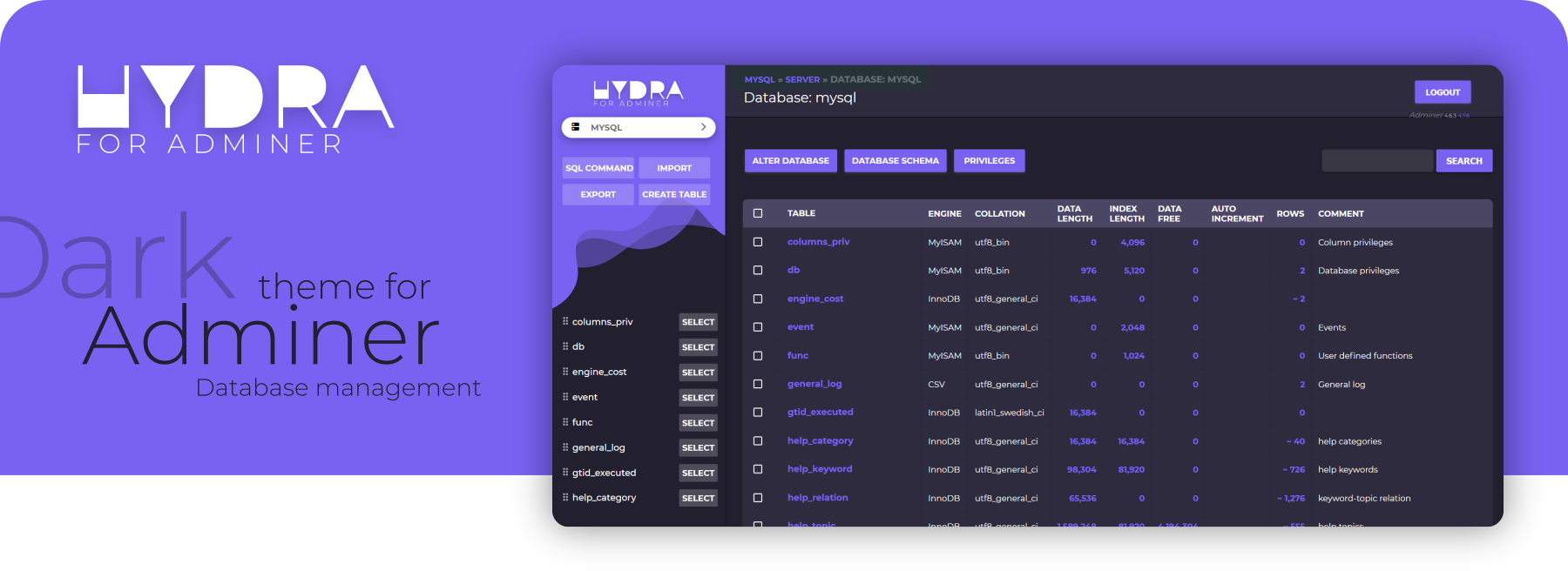 Hydra, Material Design Dark Theme for Adminer is a clone made from Adminer-Material-Theme