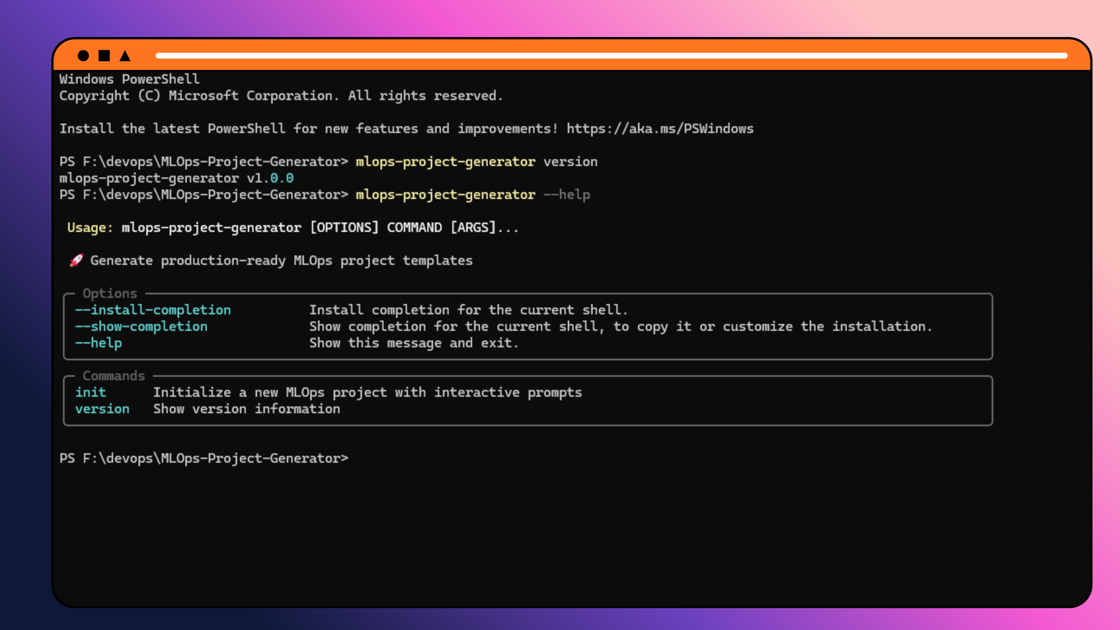mlops-project-generator validate --path . || exit 1- One-liner project generation with command-line flags