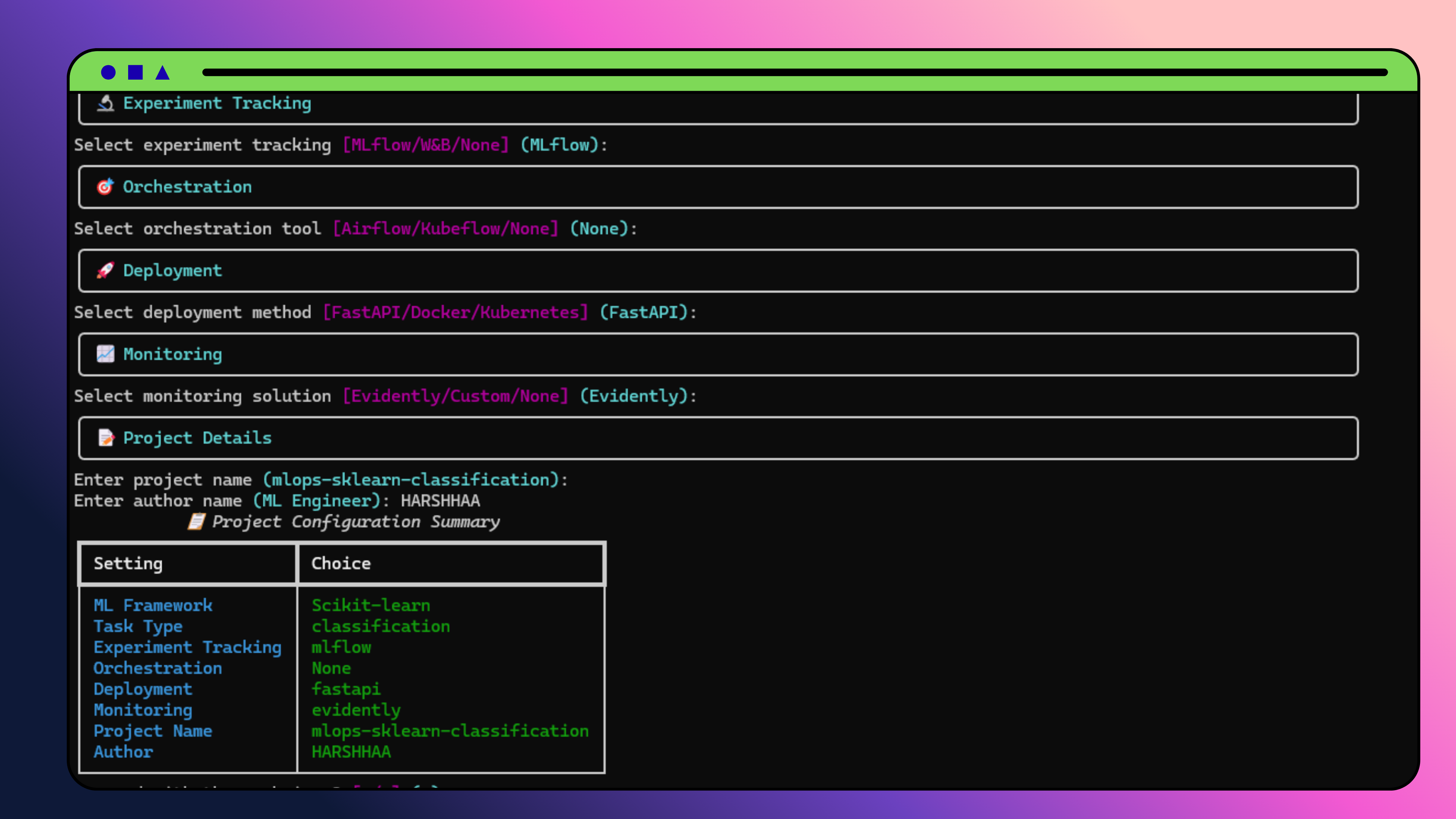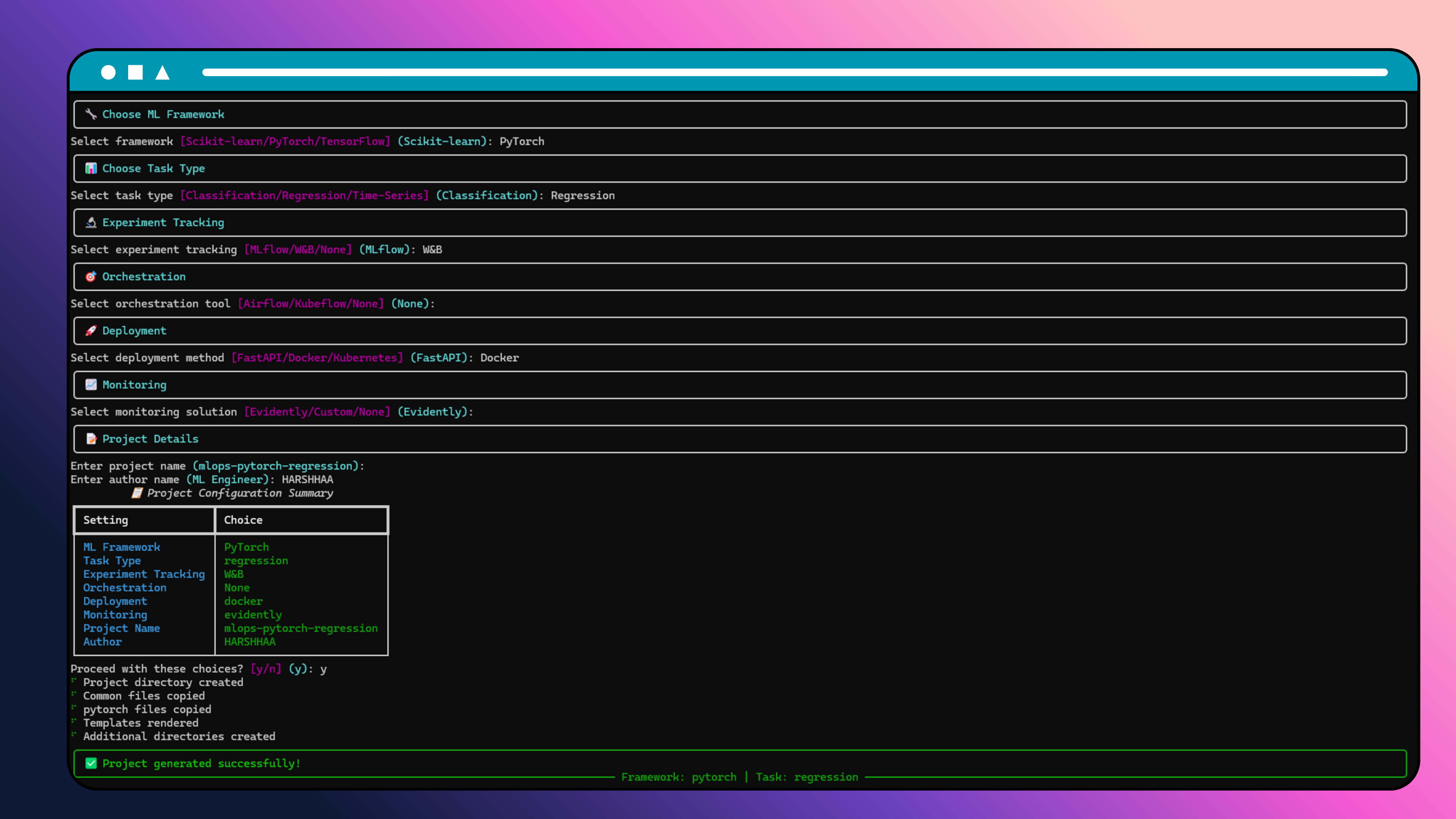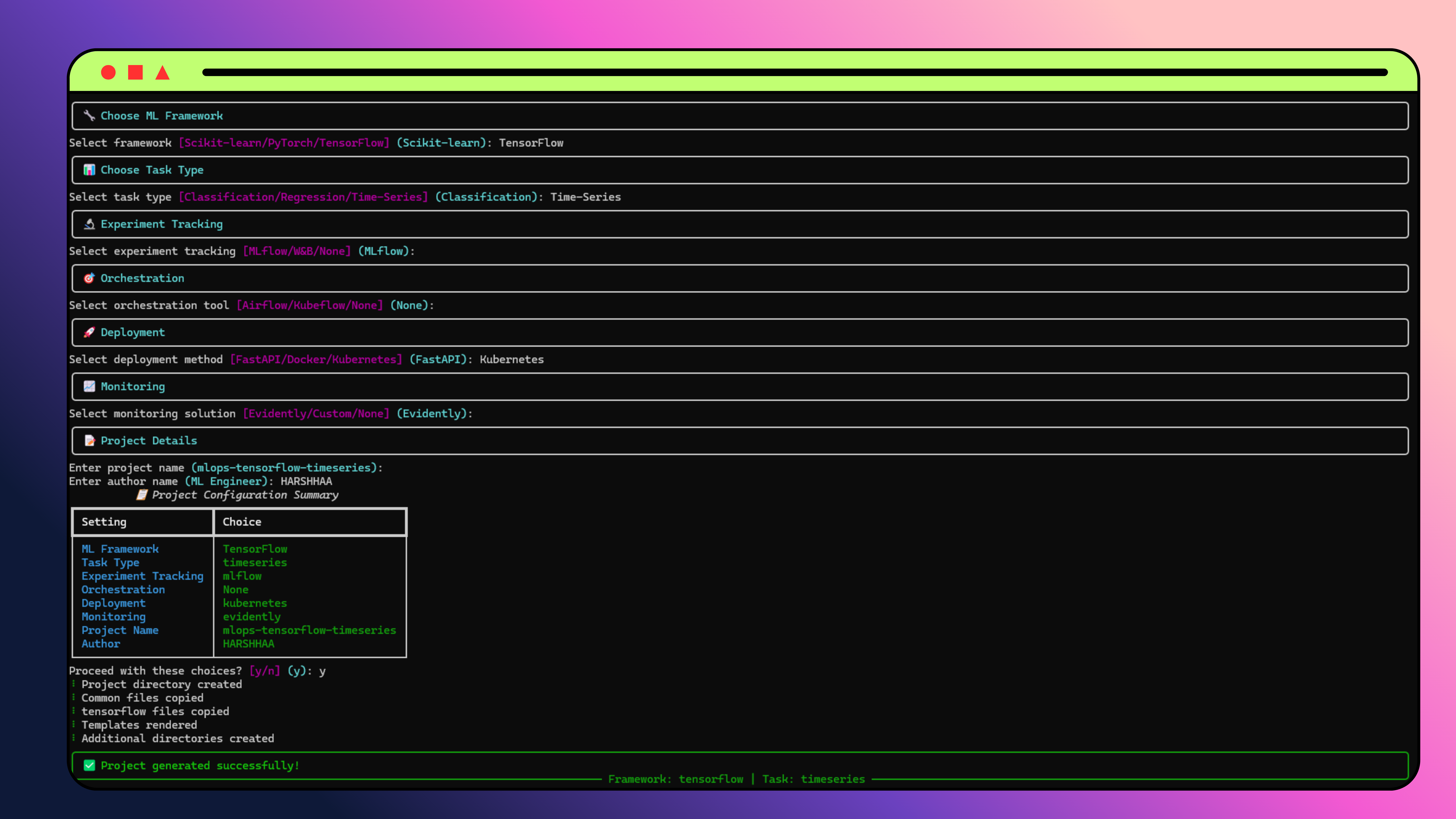 A CLI tool that generates production-ready MLOps project templates for Scikit-learn, PyTorch, and TensorFlow.