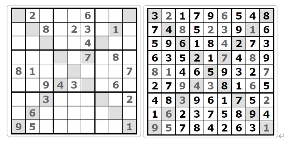对角线数独游戏[12-13]是一种变型的数独,即在上述普通数独的基础上又增加了一类约束:对角线约束,如图1.4所示。对角线约束要求在两条对角线(撇对角线与捺对角线)上的数字也不能重复。