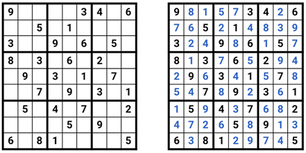 普通数独游戏要求在9×9的网格中每个单元(cell)填入1至9的一个数字,必须满足三种约束:每一行、每一列及9个3×3的盒子中的数字都不重复。