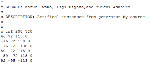 在每个CNF文件的开始,由‘c’开头的是若干注释说明行;‘p’开头的行说明公式的总体信息,包括:范式为CNF;公式有200个布尔变元,由1到200的整数表示;320个子句。之后每行对应一个子句,0为结束标记。46表示第46号变元,且为正文字;-46则是对应的负文字,文字之间以空格分隔。