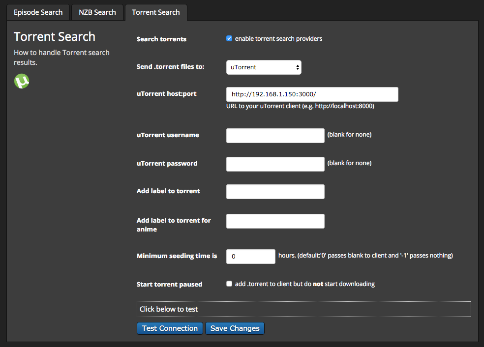 From here you should now be able to open Sickrage(/config/search/) and select uTorrent as the torrent downloader.