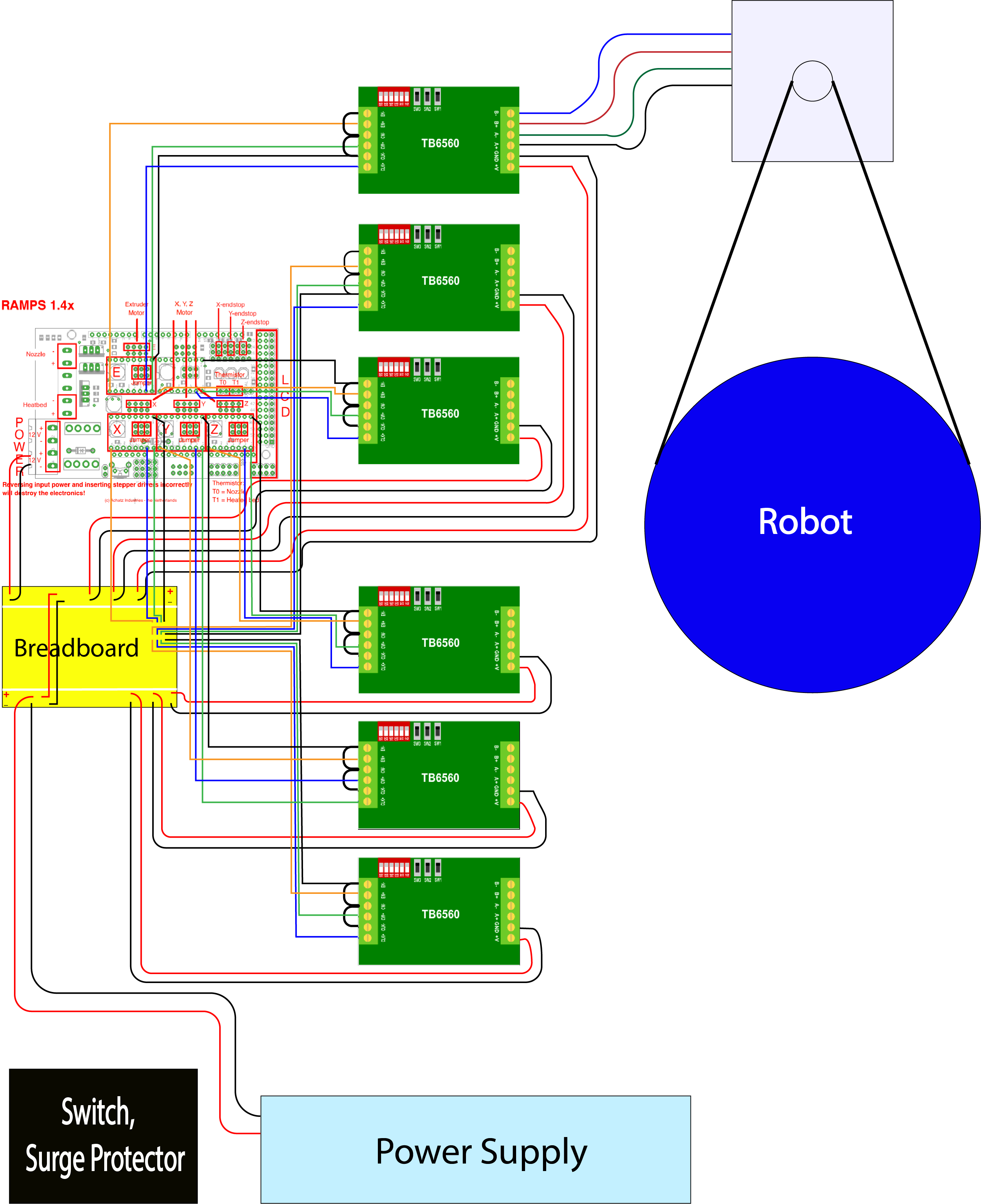 To connect the more powerful stepper motor drivers to the RAMPS shield, we use the following wiring scheme, minus the breadboard (credit to Jesse Weisberg):