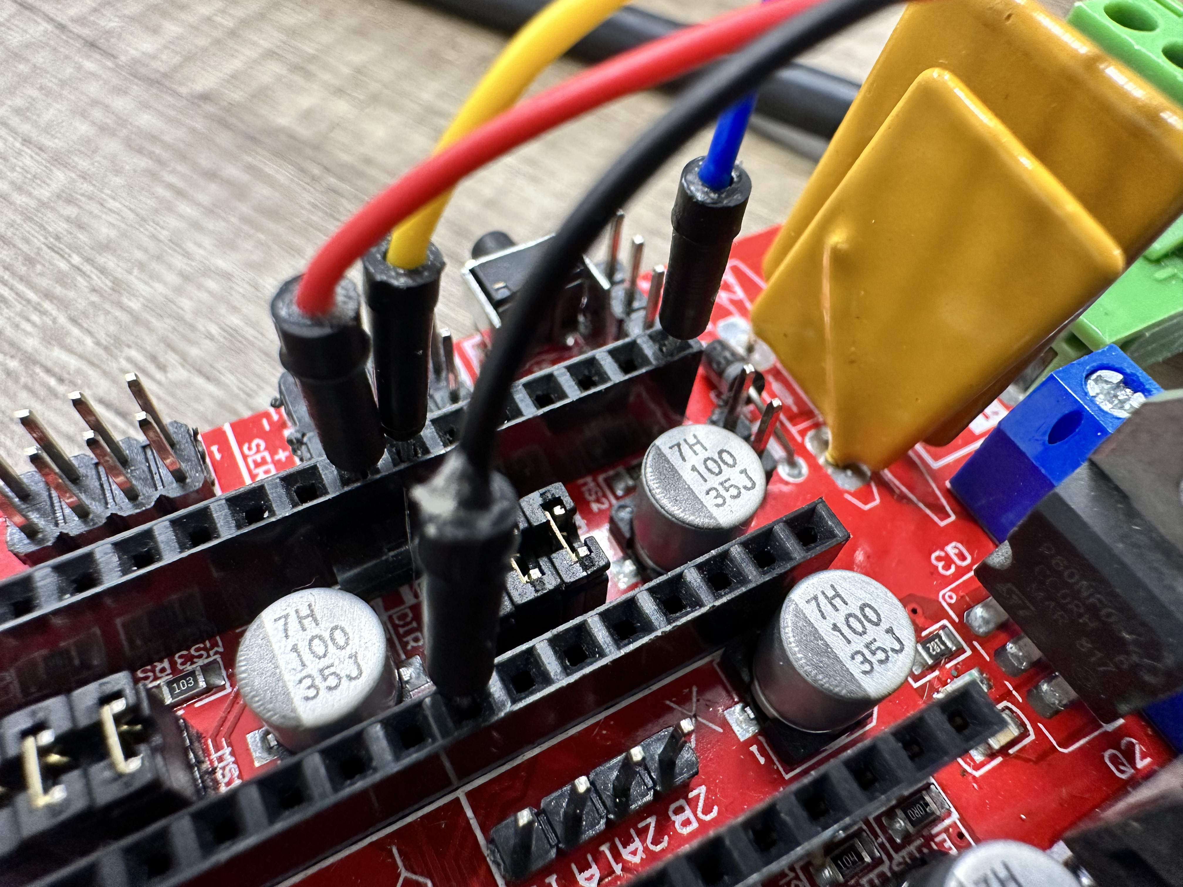 Note that, as per the wiring diagram, the three black wires connect up together before connecting to the RAMPS shield. This is done as follows: