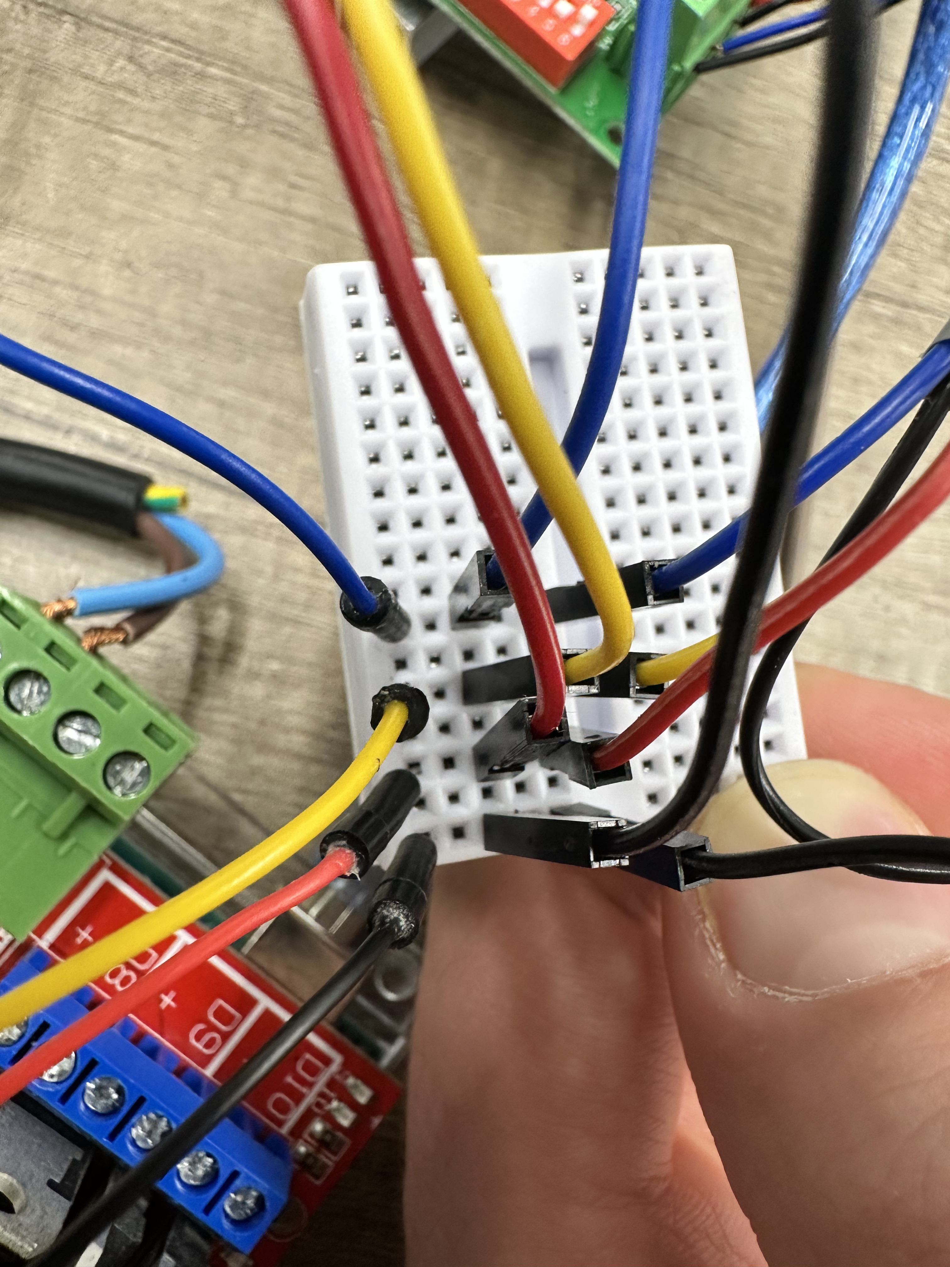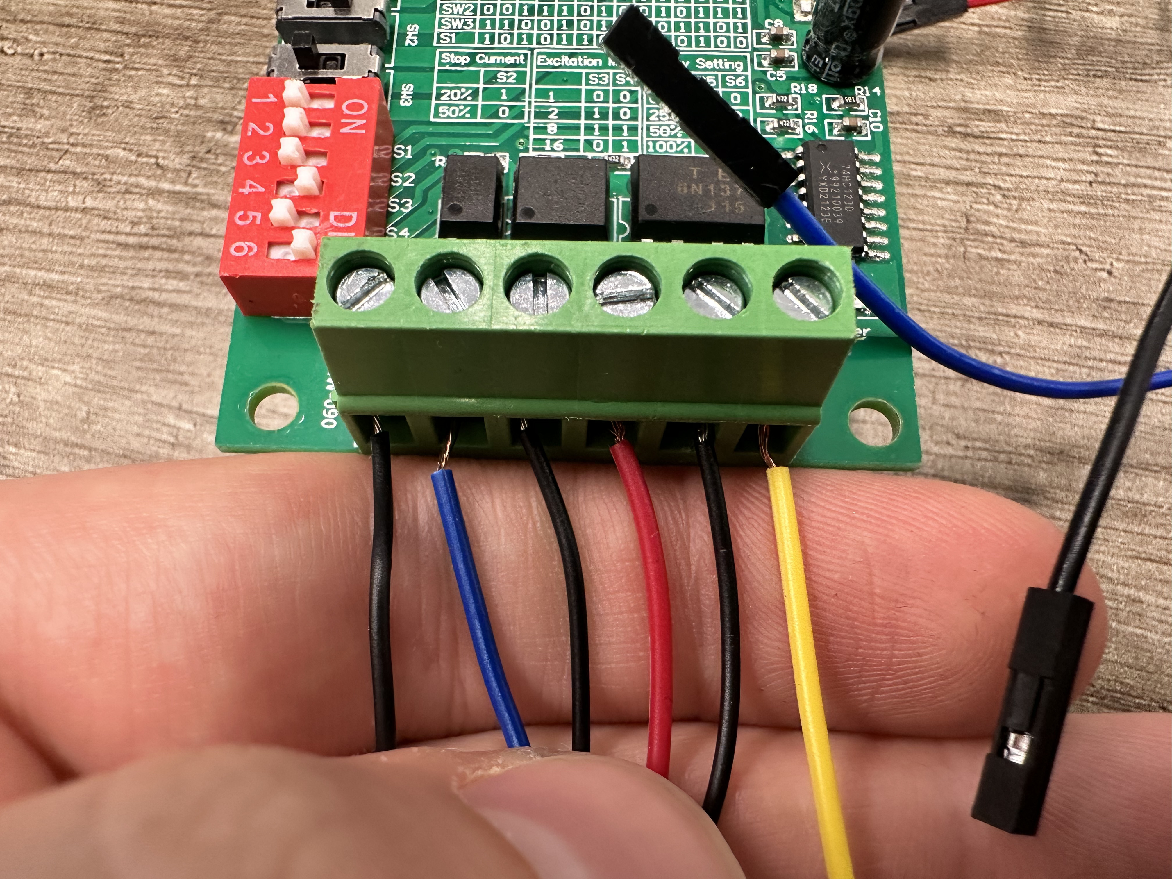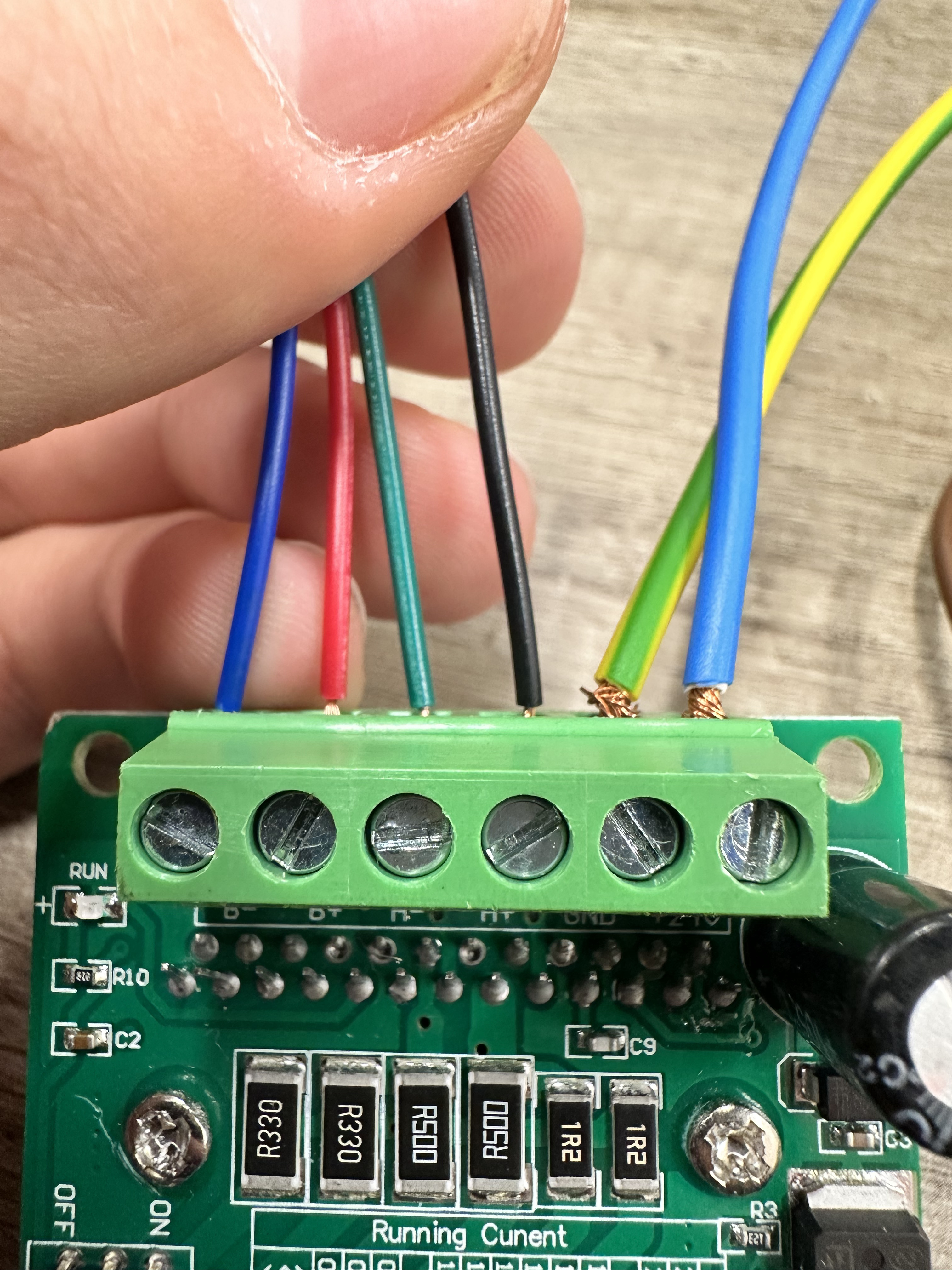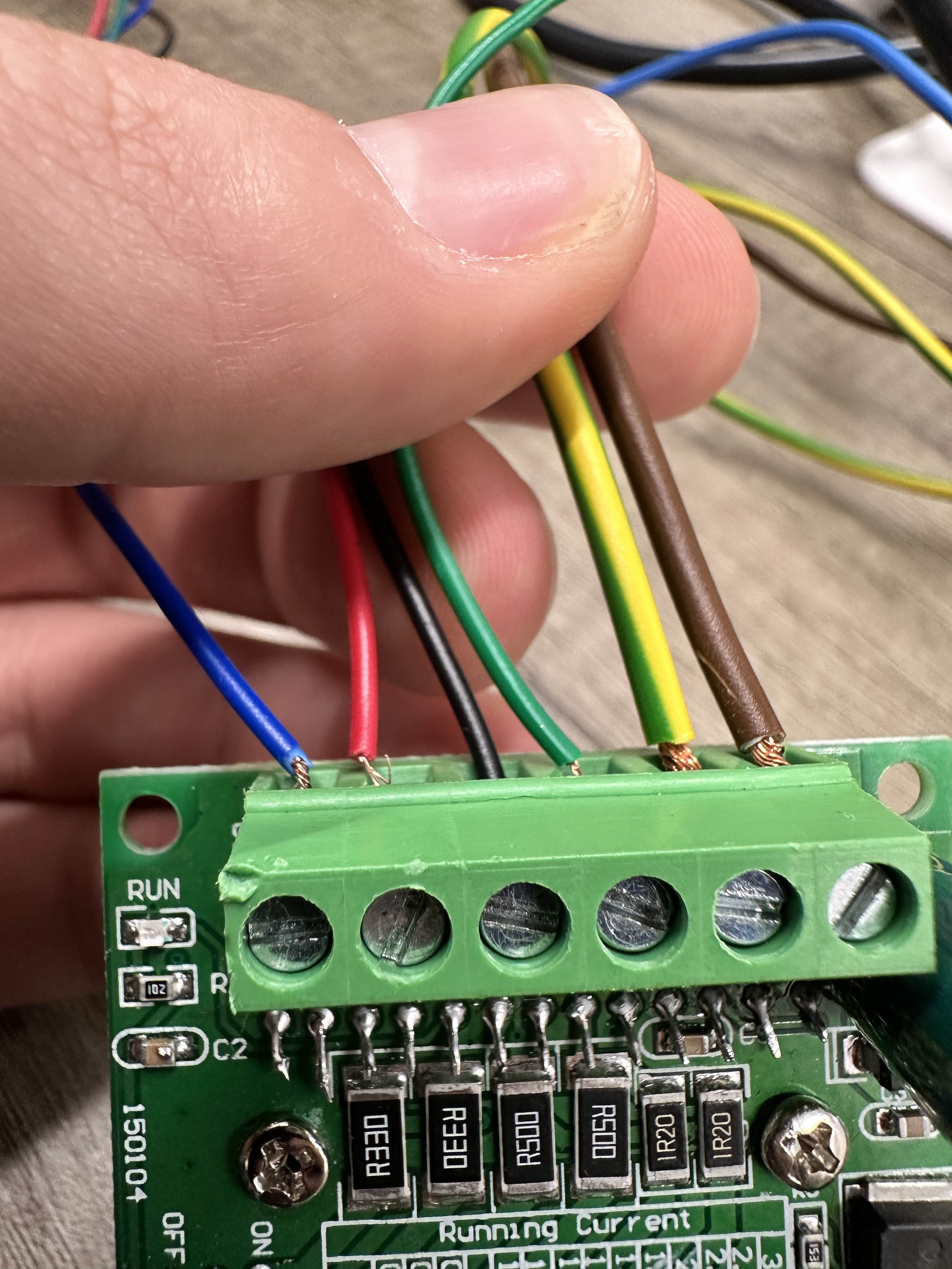 The connections on the other side of the reversed stepper motor driver are depicted below. From left to right: Blue, Red, Black, Green, GND, LIVE.