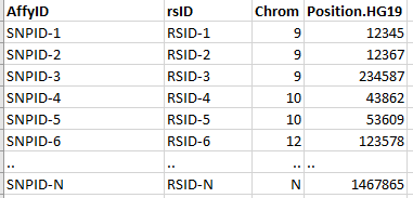 | affy_file | A dataframe-like file storing SNP information. Contains 4 columns: AffyID, rsID, chromosome and position stored in .RDS format. The AffyID column stores the SNP probe id name. This is the name that details the SNP count for each patient/subject. It may or may not be identical to rsID. |