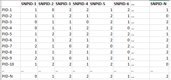 | geno_file | A dataframe-like file storing subject/patient id (rows) by SNPs (columns). The number 1 or 2 represents the copies of SNP present and zero for absence for each subject/patient. Stored in .RDS format. The column names for the SNPs should be same as the AffyIDs in affy_file. |