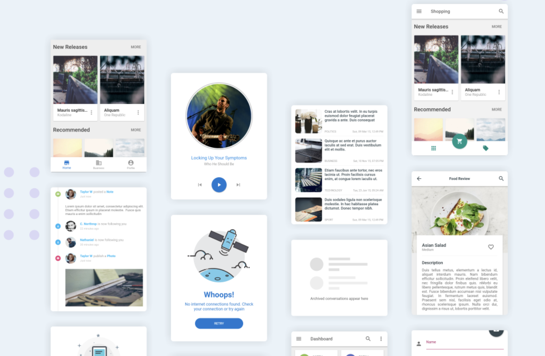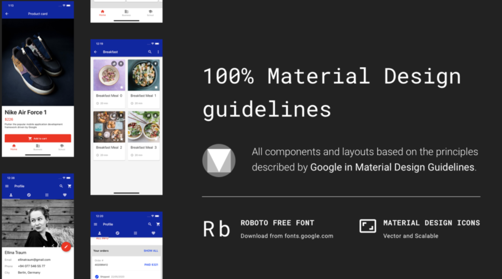 Material Design UI kit template, a collection of screens and components assembled on a flutter by the material design guide. Almost all elements required for basic applications are collapsed. There are popups, sliders, tab bars, and so on. A shortlist of features: