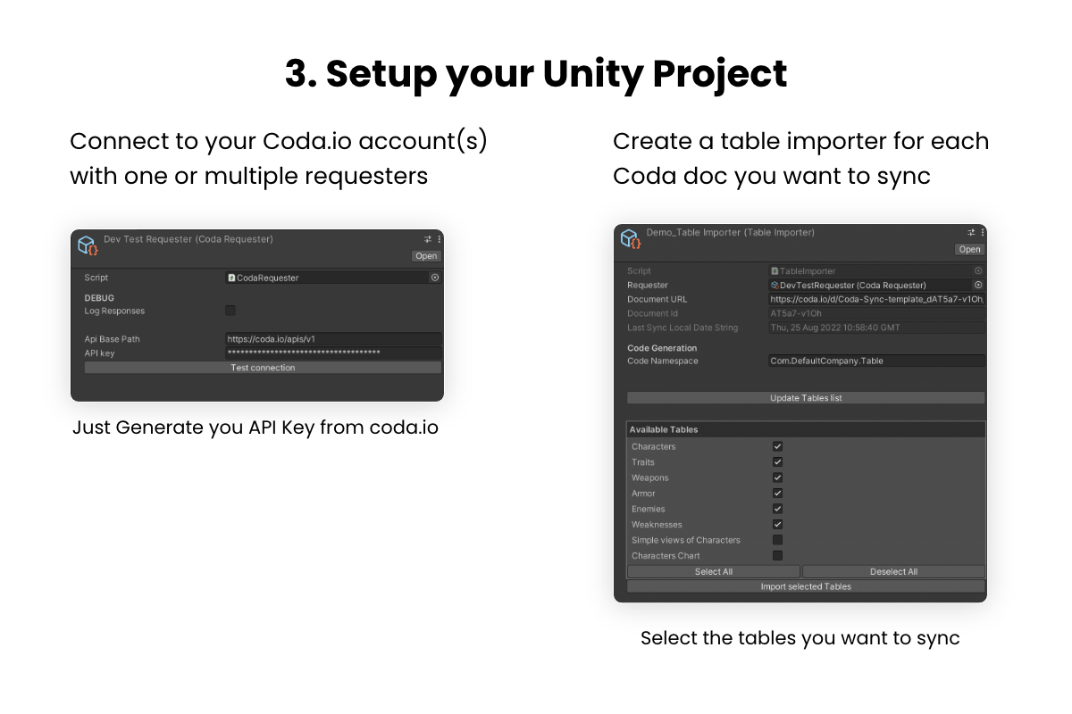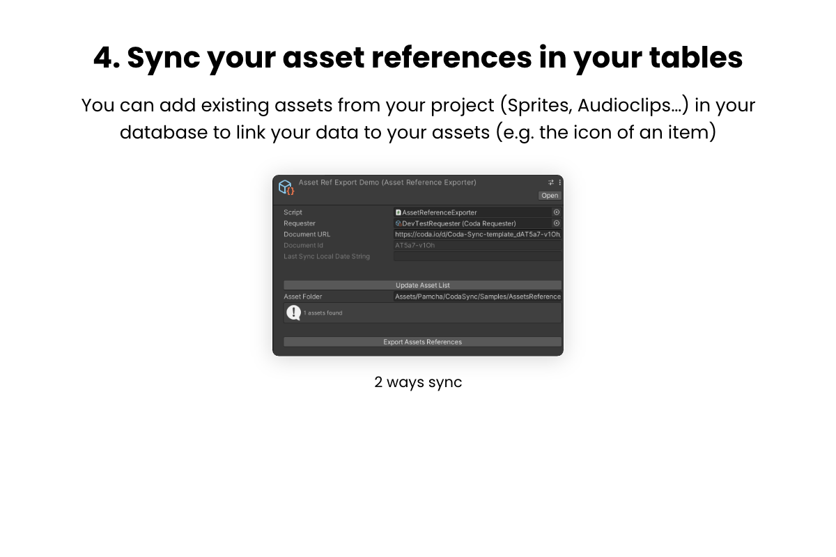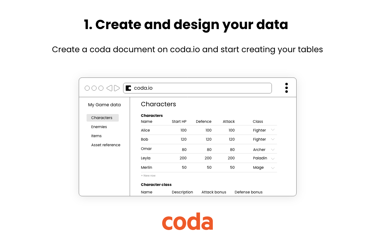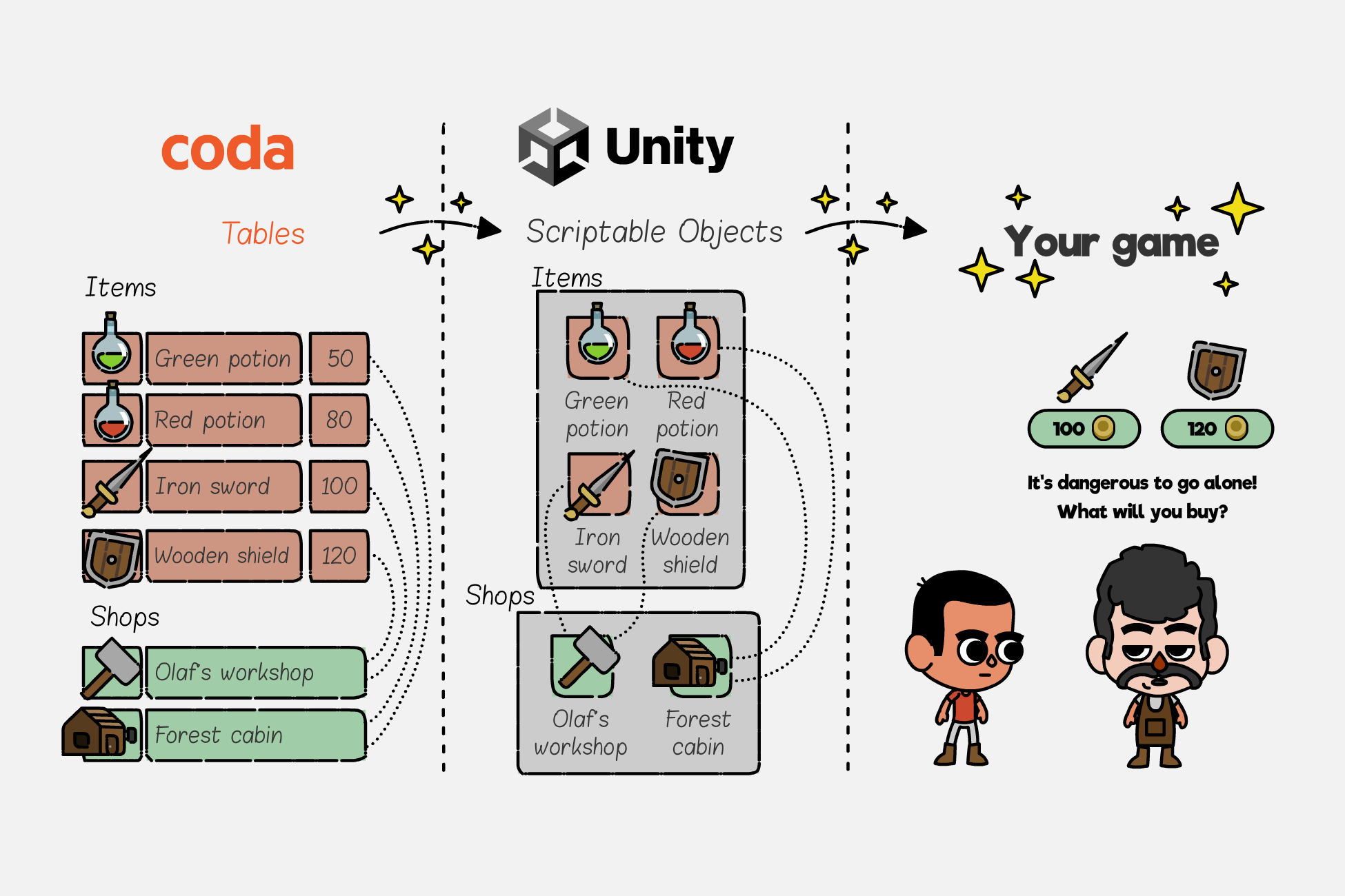 Coda Sync for Unity allows you to synchronize the tables you have created in a coda doc (on coda.io) in your Unity Project. Your data are imported as Scriptable Objects by automatically generating a class and its instances, and ready to be used anywhere in your code or in the inspector.