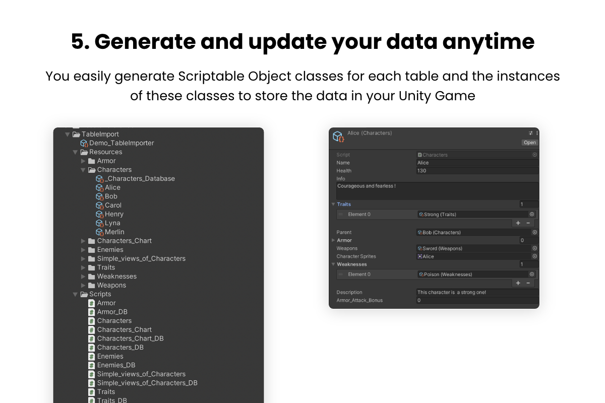 - And since these data are Scriptable Objects, they can easily be serialized and use anywhere in your game project