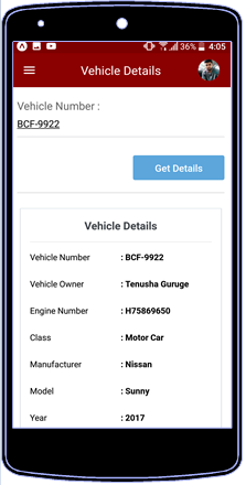 Once user enters the valid vehicle number, it displays the vehicle details of the entered vehicle.