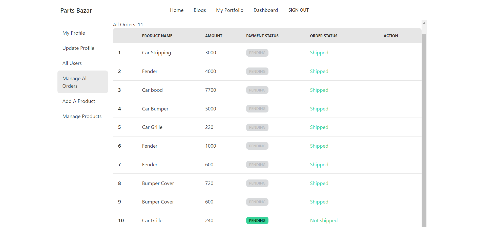 - In My Manage All Orders page, Admin can see all orders status. Admin can make pending order to shipped order.