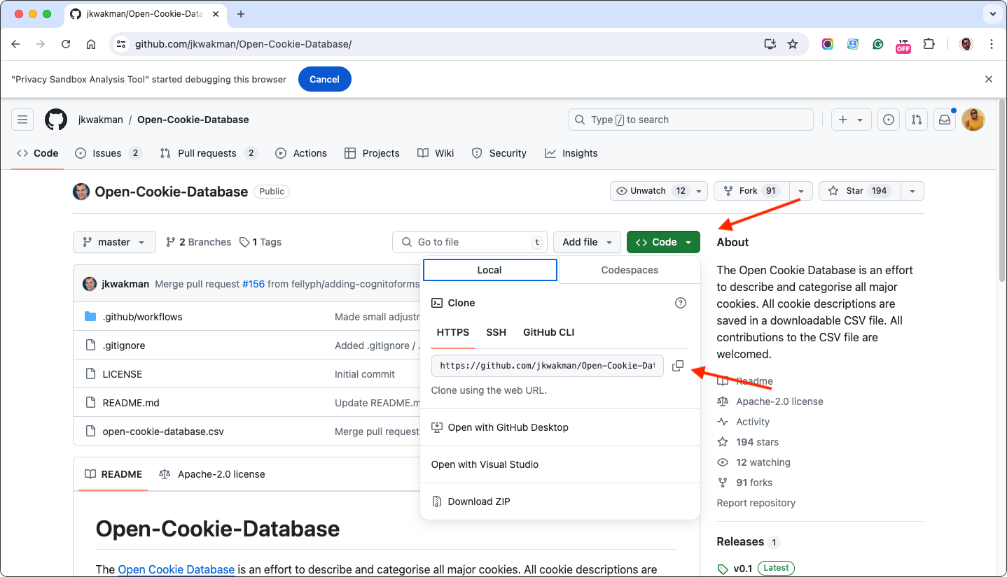Once you have your GitHub account, you must fork the Open Cookie Database repository. This step will create a repository with the same code and visibility in your account.